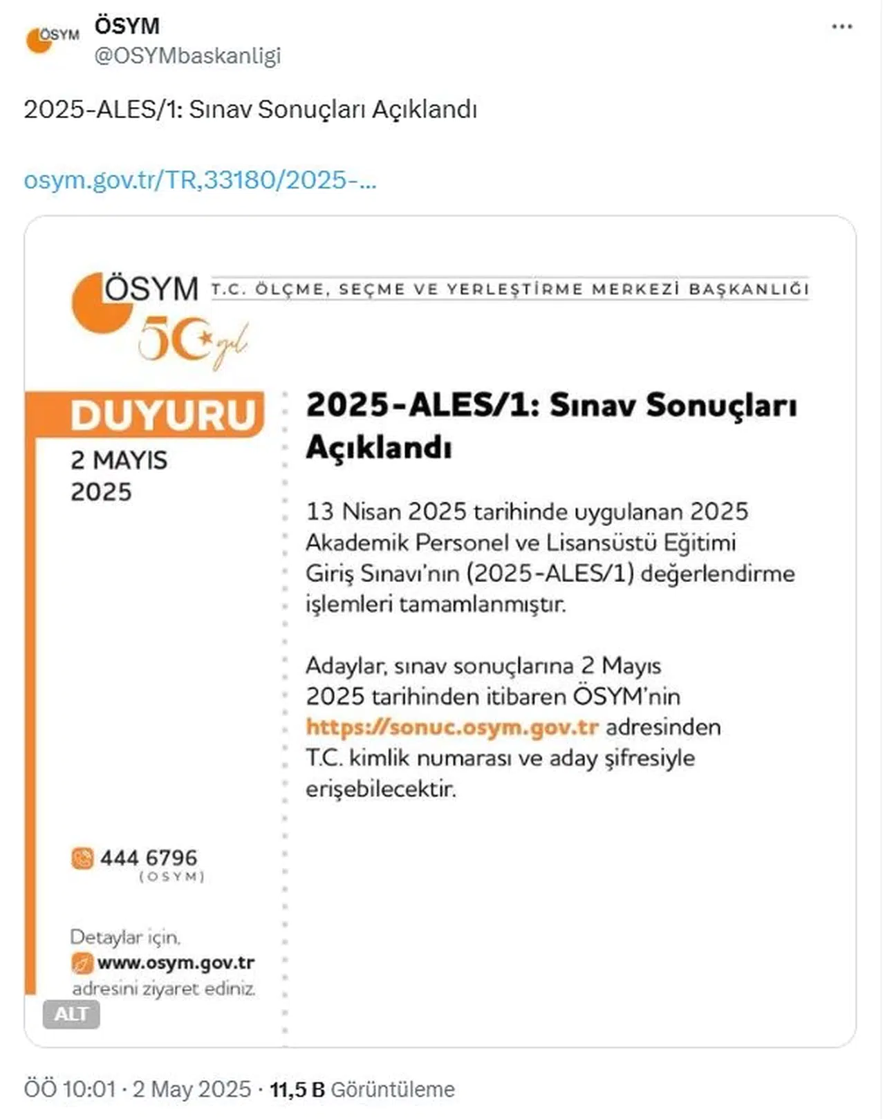 ANKARA, (DHA)- ÖLÇME Seçme ve Yerleştirme Merkezi Başkanlığı (ÖSYM), 2025 Akademik Personel ve Lisansüstü Eğitimi Giriş Sınavı (2025-ALES/1) sonuçlarının açıklandığını duyurdu.