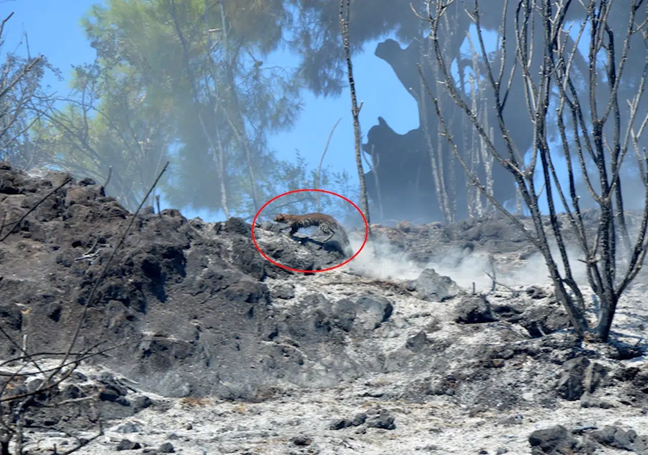 Yanan alanda, köz ve küllerin arasından kaçmaya çalışan sansar kameralara yansıdı. Jandarma yangınla ilgili inceleme başlattı. (DHA)