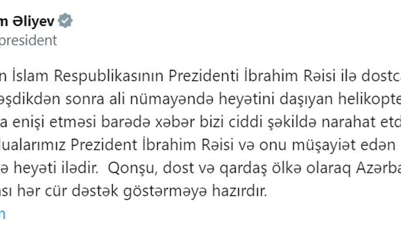 Aliyev, yaptığı açıklamada, “Bugün İran İslam Cumhuriyeti Cumhurbaşkanı İbrahim Reisi ile gerçekleştirdiğimiz görüşmenin ardından, üst düzey heyeti taşıyan helikopterin İran'a acil iniş yaptığı haberi bizleri ciddi şekilde endişelendirdi. Yüce Allah'a dualarımız Cumhurbaşkanı İbrahim Reisi ve beraberindeki heyetle birlikte. Azerbaycan Cumhuriyeti komşu, dost ve kardeş bir ülke olarak her türlü desteği vermeye hazırdır” dedi.