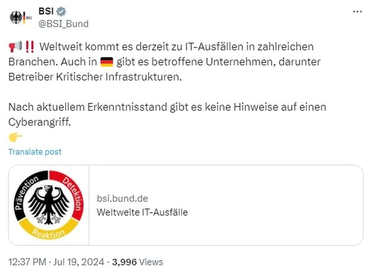 Bunun nedenlerinden biri, Crowdstrike (Falcon) üreticisine ait bir BT güvenlik çözümünün hatalı bir şekilde güncellenmesidir. Bu çözüm, daha sonra arızalanan çok sayıda başka BT hizmeti tarafından da kullanılıyor. BSI'dan alınan bilgiye göre, etkilenen çözümün üreticisi, etkilenenlerin uygulaması gereken bir geçici çözüm bildirmiştir.