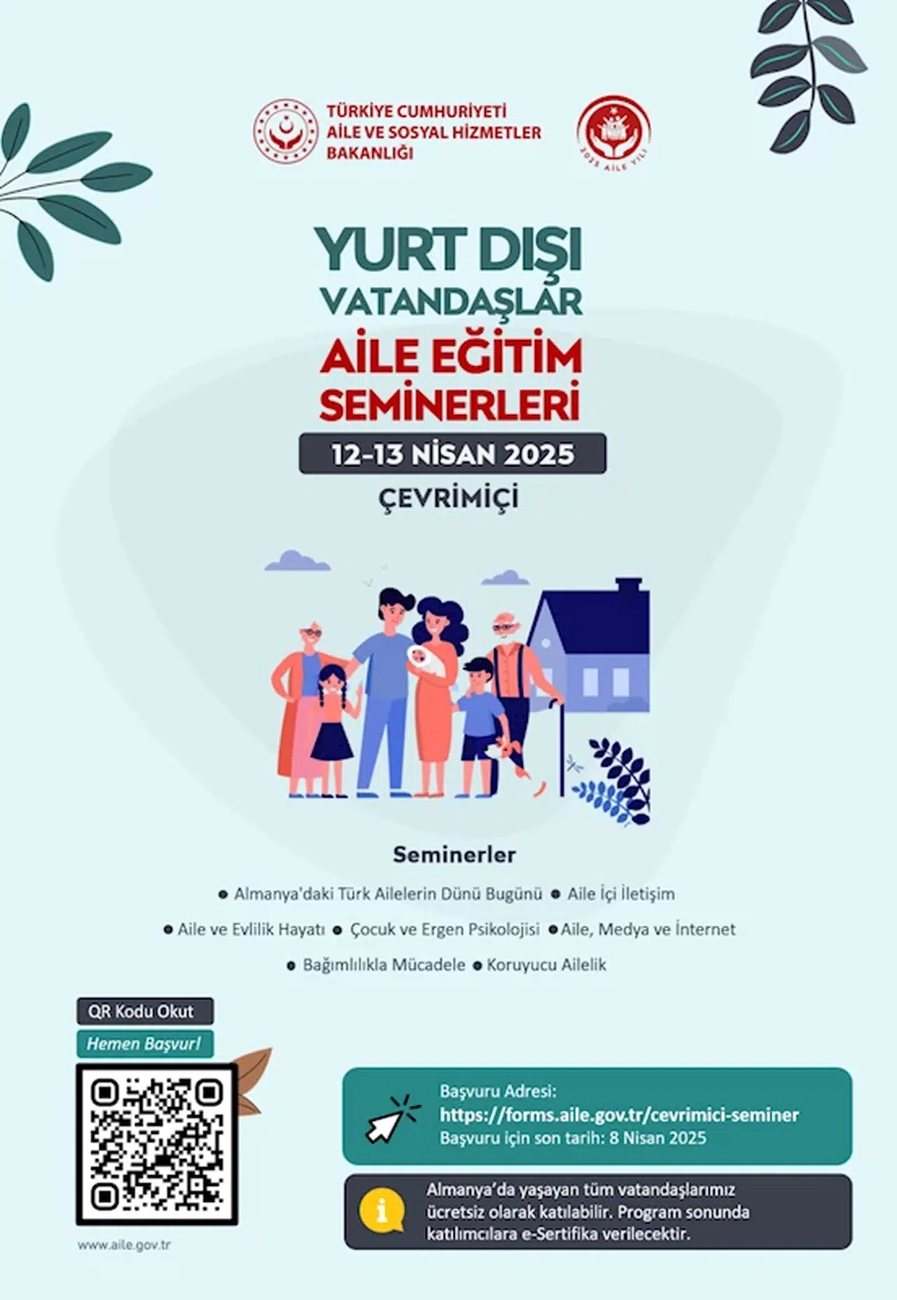 Ruken KADIOĞLU/ANKARA, (DHA)- AİLE ve Sosyal Hizmetler Bakanlığı, 2025 'Aile Yılı' etkinlikleri çerçevesinde, aile kurumunun güçlendirilmesi amacıyla Almanya'da yaşayan Türk vatandaşlarına yönelik 12-13 Nisan'da çevrim içi eğitim seminerleri düzenleyecek.