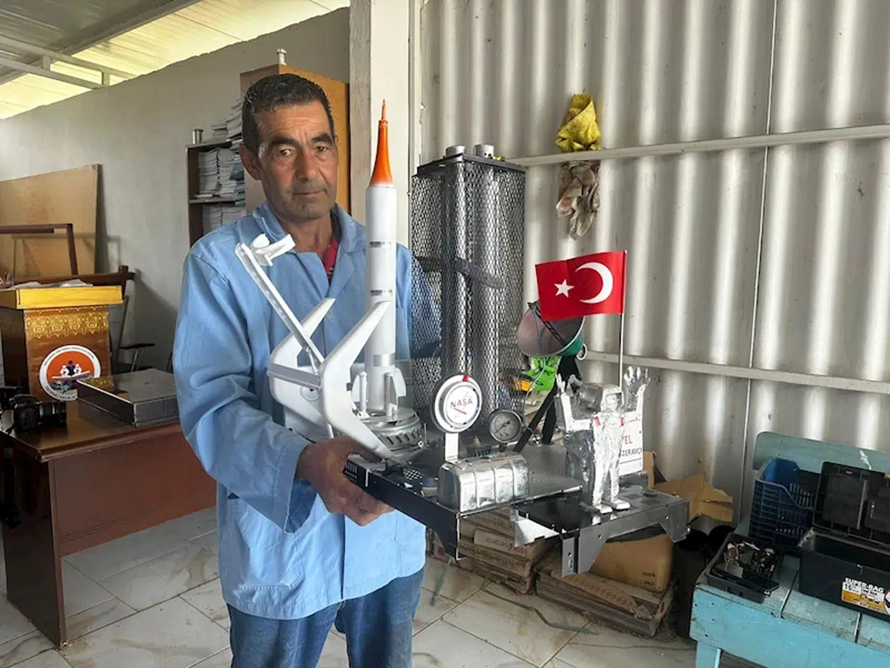 Mehmet DOĞANER/ERDEMLİ(Mersin), (DHA)-MERSİN’in Erdemli ilçesinde, Halk Eğitim Merkezi ve Akşam Sanat Okulu El Sanatları usta öğreticisi Mustafa Ercan, topladığı atık malzemelerden uzaya giden ilk Türk Astronot Alper Gezeravcı’nın ve onu taşıyan uzay aracının minyatürünü yaptı.