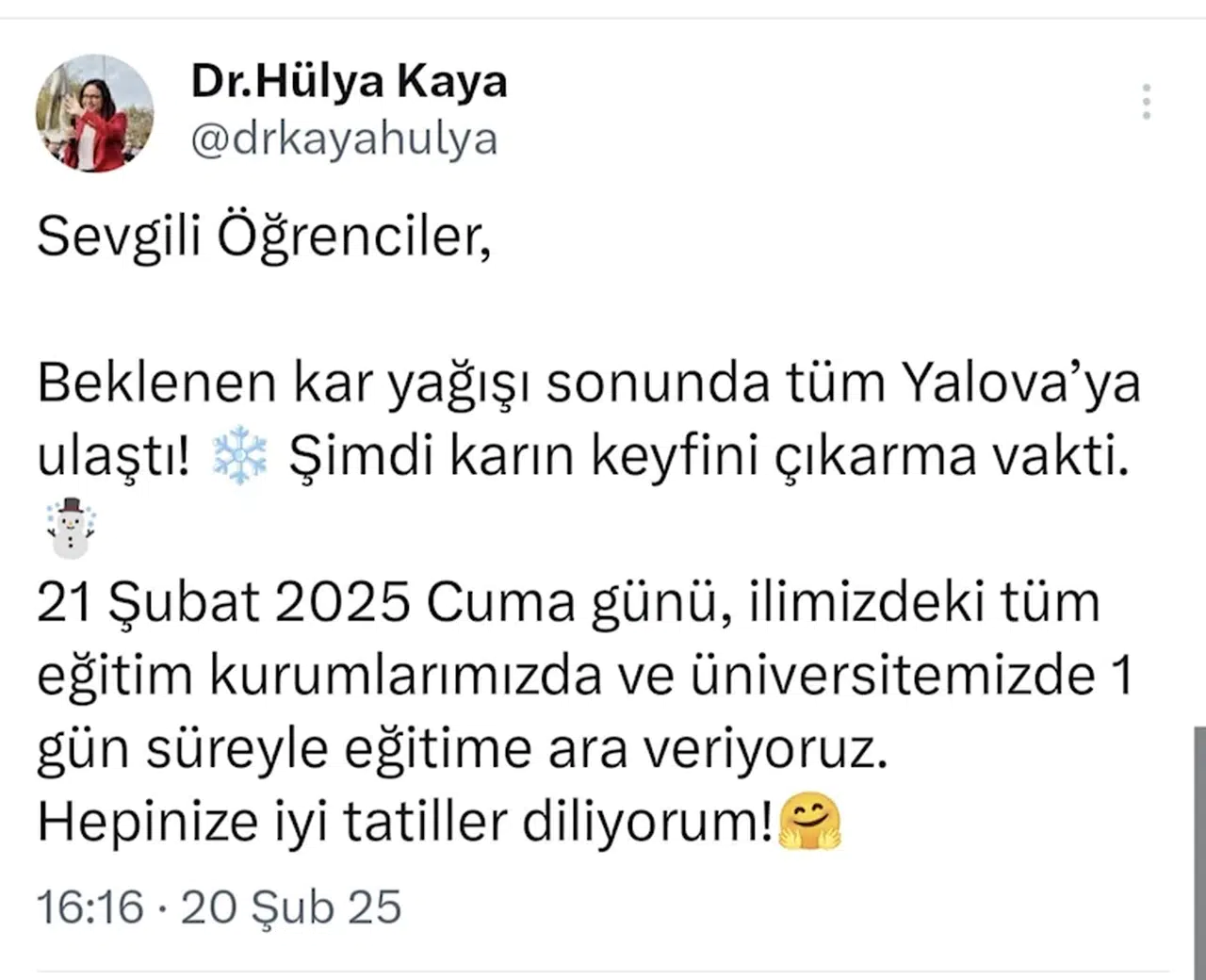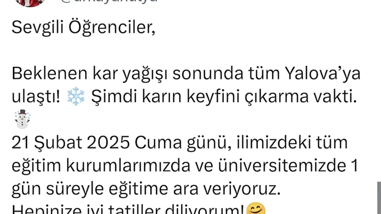 Yalova'da kar yağışı aralıklarla etkisini sürdürürken, eğitime yarın ara verildi. Tatil kararını sosyal medya hesabından duyuran Yalova Valisi Hülya Kaya, "Sevgili öğrenciler, beklenen kar yağışı sonunda tüm Yalova'ya ulaştı. Şimdi karın keyfini çıkarma vakti. 21 Şubat Cuma günü ilimizdeki tüm eğitim kurumlarımızda ve üniversitemizde eğitime 1 gün süreyle ara veriyoruz. Hepinize iyi tatiller diliyorum" ifadelerine yer verdi. (DHA)