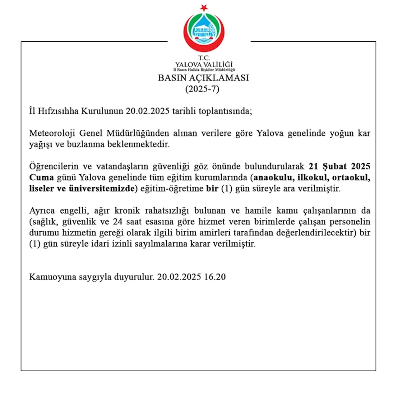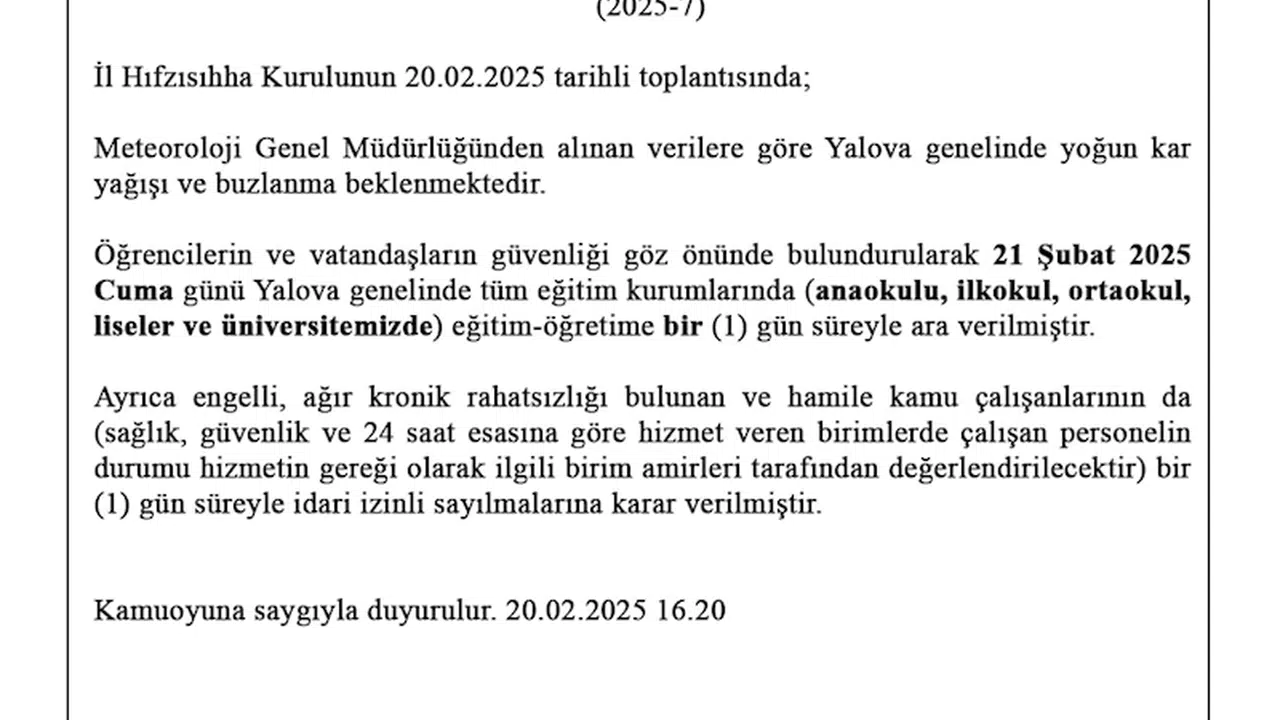 Yalova'da eğitime yarın 1 günlük ara verilmesinin ardından, kamu kurumlarında çalışan hamile, engelli ve kronik rahatsızlığı bulunan personelin de idari izinli sayılacağı duyuruldu. Yalova Valiliği’nden yapılan açıklamada, "İl Hıfzısıhha Kurulunun 20.02.2025 tarihli toplantısında; Meteoroloji Genel Müdürlüğünden alınan verilere göre Yalova genelinde yoğun kar yağışı ve buzlanma beklenmektedir. Öğrencilerin ve vatandaşların güvenliği göz önünde bulundurularak 21 Şubat 2025 Cuma günü Yalova genelinde tüm resmi ve özel örgün ve yaygın eğitim kurumlarında (anaokulu, ilkokul, ortaokul, liseler ve üniversitemizde) eğitim-öğretime bir (1) gün süreyle ara verilmiştir. Ayrıca engelli, ağır kronik rahatsızlığı bulunan ve hamile kamu çalışanlarının da (sağlık, güvenlik ve 24 saat esasına göre hizmet veren birimlerde çalışan personelin durumu hizmetin gereği olarak ilgili birim amirleri tarafından değerlendirilecektir) bir (1) gün süreyle idari izinli sayılmalarına karar verilmiştir" denildi. (DHA)
