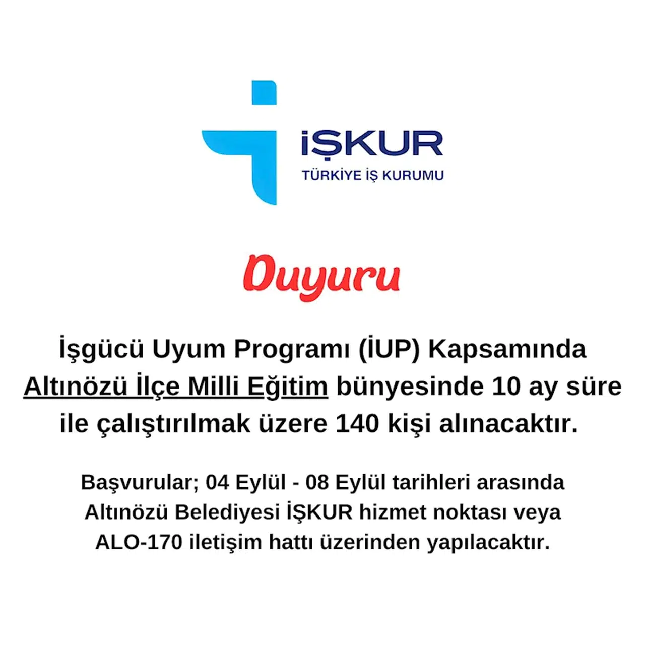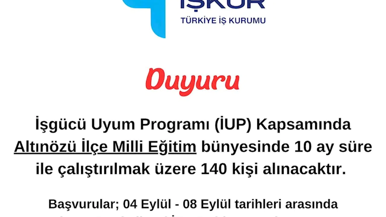 Samim SELÇUK/ Hatay, (DHA) – HATAY’ın Altınözü ilçesinde okullara İşgücü Uyum Programı kapsamında Altınözü İlçe Milli Eğitim Müdürlüğü bünyesinde 10 ay süre ile çalıştırılmak üzere 140 kişi alınacak.