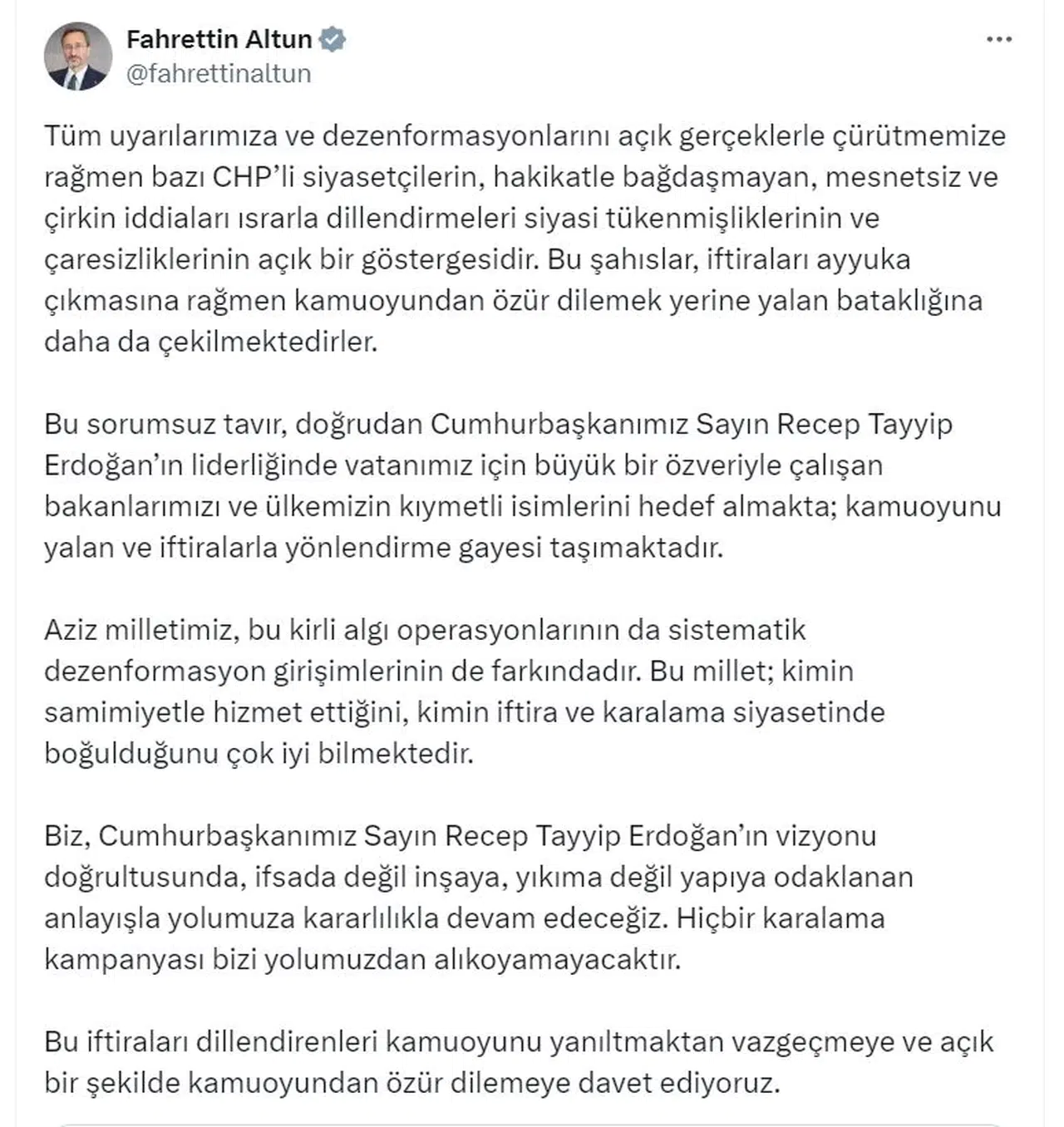 ANKARA, (DHA)- İLETİŞİM Başkanı Fahrettin Altun, "Tüm uyarılarımıza ve dezenformasyonlarını açık gerçeklerle çürütmemize rağmen bazı CHP'li siyasetçilerin, hakikatle bağdaşmayan, mesnetsiz ve çirkin iddiaları ısrarla dillendirmeleri siyasi tükenmişliklerinin ve çaresizliklerinin açık bir göstergesidir" dedi.