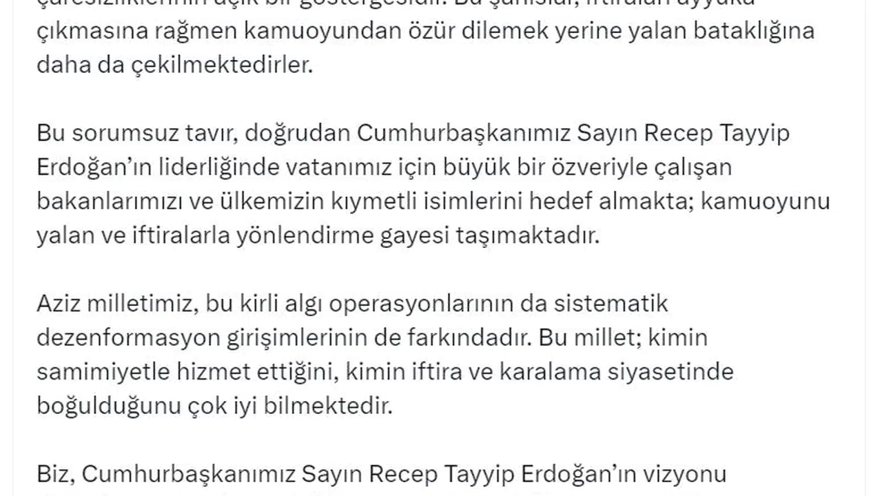 Aziz Türk milletinin, bu kirli algı operasyonlarının ve sistematik dezenformasyon girişimlerinin farkında olduğunu işaret eden Altun, "Bu millet; kimin samimiyetle hizmet ettiğini, kimin iftira ve karalama siyasetinde boğulduğunu çok iyi bilmektedir. Biz, Cumhurbaşkanımız Sayın Recep Tayyip Erdoğan’ın vizyonu doğrultusunda, ifsada değil inşaya, yıkıma değil yapıya odaklanan anlayışla yolumuza kararlılıkla devam edeceğiz. Hiçbir karalama kampanyası bizi yolumuzdan alıkoyamayacaktır. Bu iftiraları dillendirenleri kamuoyunu yanıltmaktan vazgeçmeye ve açık bir şekilde kamuoyundan özür dilemeye davet ediyoruz" ifadelerini kullandı. (DHA)