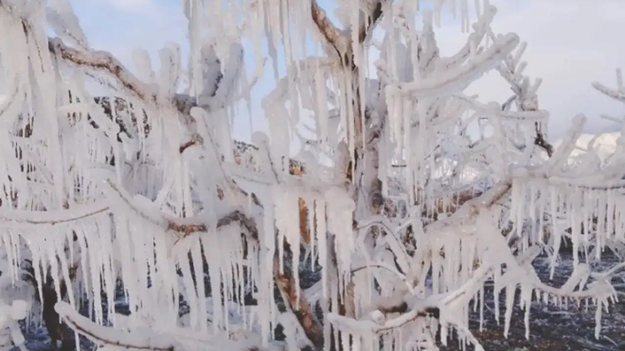 Kentte 1 haftadır etkili olan soğuk hava, meyve yetiştiricilerinin faaliyetlerini de olumsuz etkiledi. Hava sıcaklığının eksi 9 dereceye kadar düşmesi sonucu, çiftçi, ağaçların zarar görmesini önlemek amacıyla fıskiyeyle su sıktı. Yaşanan don sonucu ağaçların dallarında sarkıtlar oluştu.