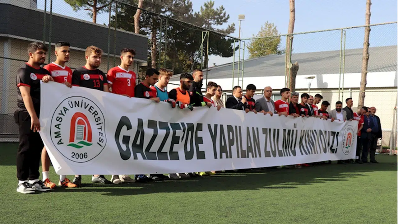 AMASYA (AA) - Amasya Üniversitesi Kültür ve Spor Kulübü’nün organize ettiği futbol turnuvasında, İsrail’in Gazze'ye yönelik saldırılarına karşı sporcular pankart açarak tepki gösterdi.