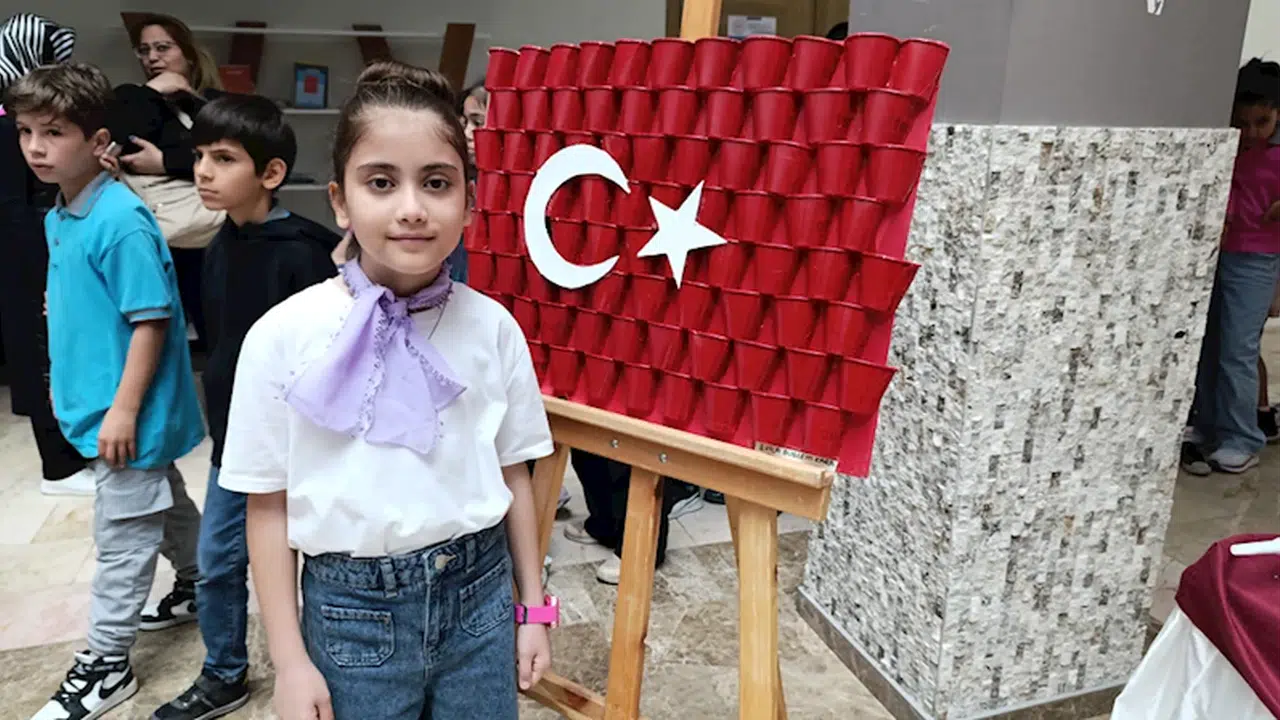 Öğrencilerden Esila Buğlem Kara, atık malzemeleri kullanarak tasarladığı Türk bayrağı tablosunu Amasya Belediye Başkanı Turgay Sevindi'ye hediye etti.