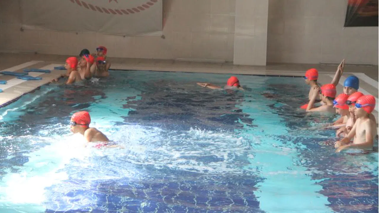 Amasya Kapalı Yüzme Havuzu'nda düzenlenen eğitimlerde, 8-14 yaş arası 20 çocuk, polis ve sporculardan oluşan uzman eğiticilerden yüzme öğreniyor.