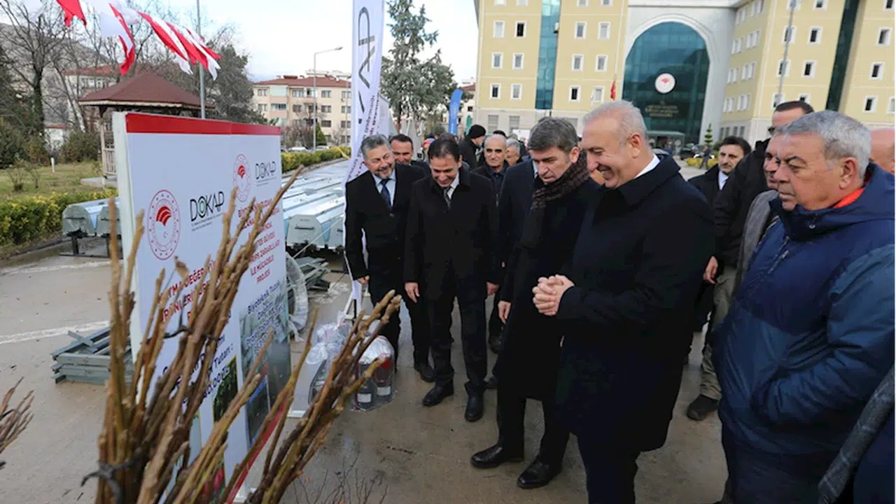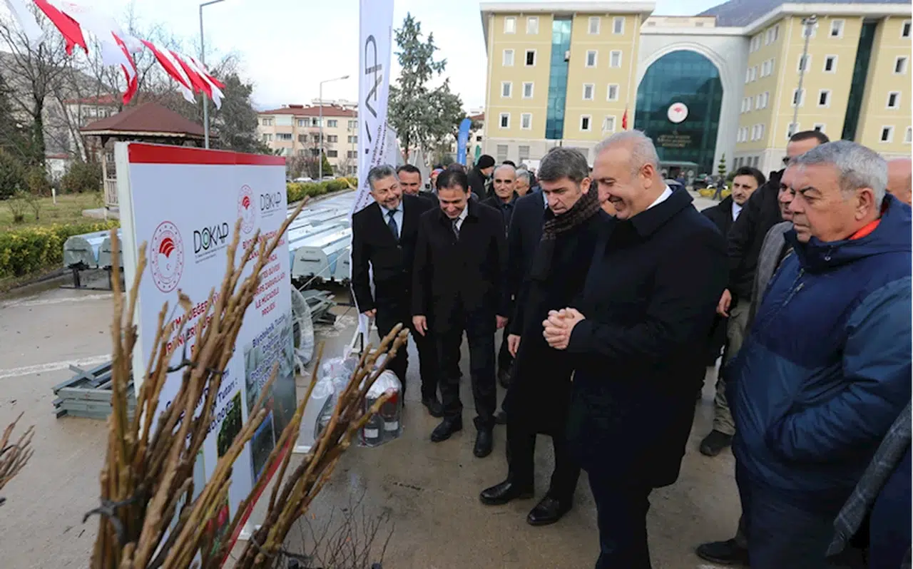 Konuşmaların ardından, Küçükbaş Hayvancılığı Geliştirme Projesi kapsamında 55 betonarme sıvat, Sağlıklı Kuzular Projesi kapsamında 250 yemlik, 250 suluk, Küçükbaş Hayvancılığın Geliştirilmesi Projesi kapsamında 4 koyun banyoluğu, 1 kırkım bileme makinesi, 10 küçükbaş hayvan kırkım makinesi, Yüksek Sistem Bağ Yetiştiriciliği Projesi kapsamında 90 dekar alan için yüksek sistem bağ ekipmanı, Katma Değeri Yüksek Ürünlerin Üretilmesi Projesi kapsamında çeşitli meyve fidanı ve sebze fideleri, Domates Güvesi ve Thrips Zararlıları ile Mücadele Projesi kapsamında ise 483 biyoteknik tuzak üreticilere teslim edildi.