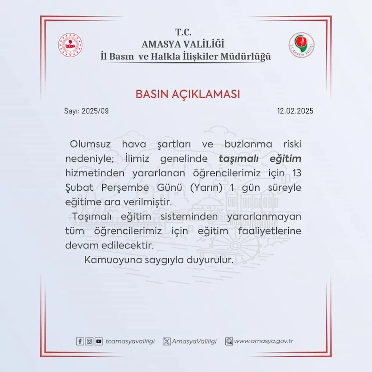 Şerife Serap KARA/AMASYA, (DHA)- AMASYA’da olumsuz hava şartları ve buzlanma riski nedeniyle taşımalı eğitime 1 gün ara verildi.