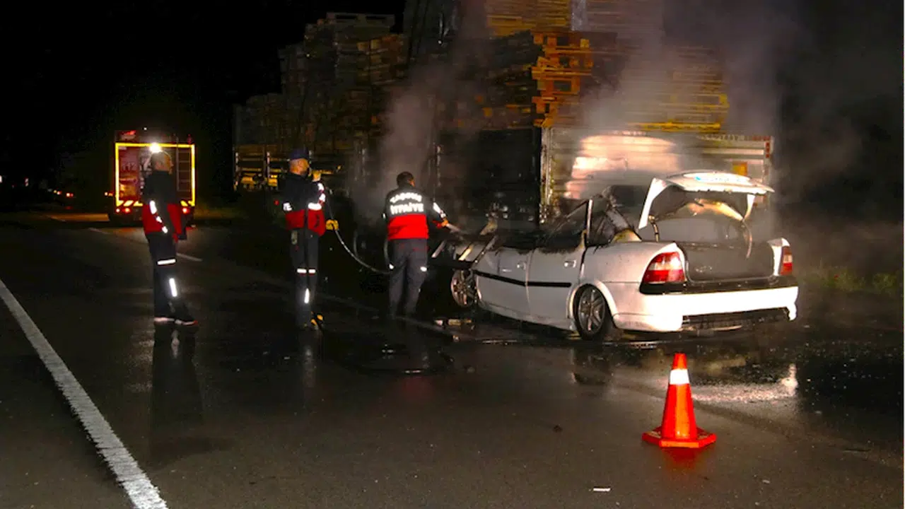Tırın altına giren otomobil yanmaya başladı. Alevler tırın üzerindeki ahşap paletlere de sıçradı.