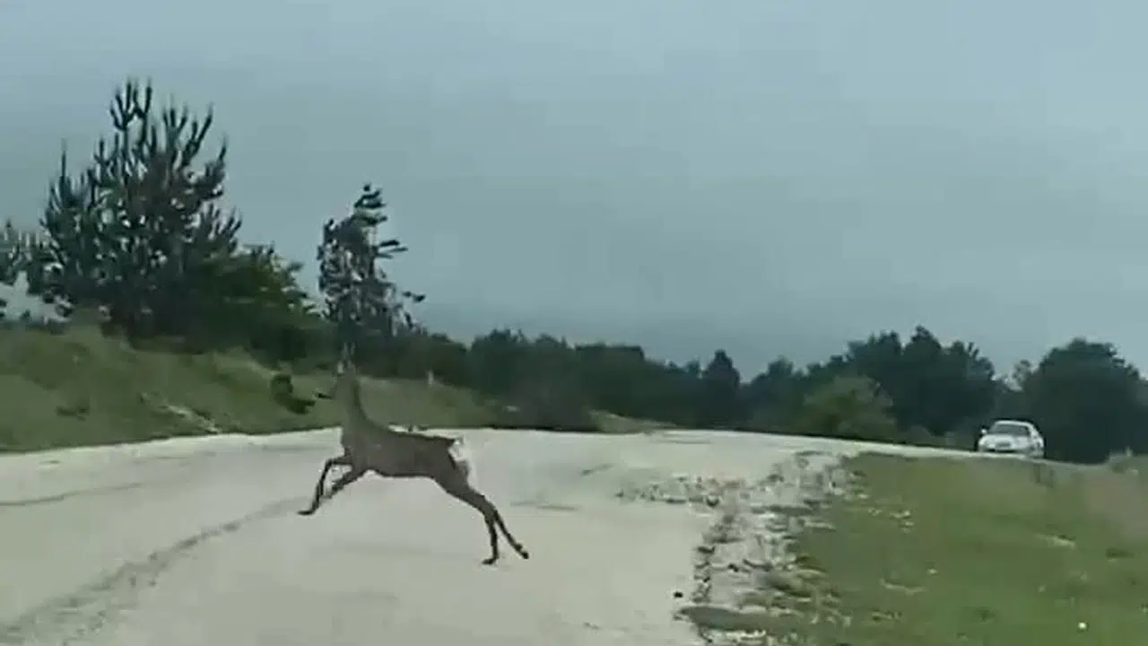 Taşova Karamuk köyü merasında Vali Yılmaz Doruk'un doğa tutkunu eşi Meral Doruk Doruk, otomobiliyle geçtiği sırada gördüğü karacayı cep telefonu kamerasıyla görüntüledi. Görüntülerde, ormanda koşuşturan karacanın otomobilin önünden hızla geçip daha sonra gözden kaybolduğu görüldü. (DHA)
