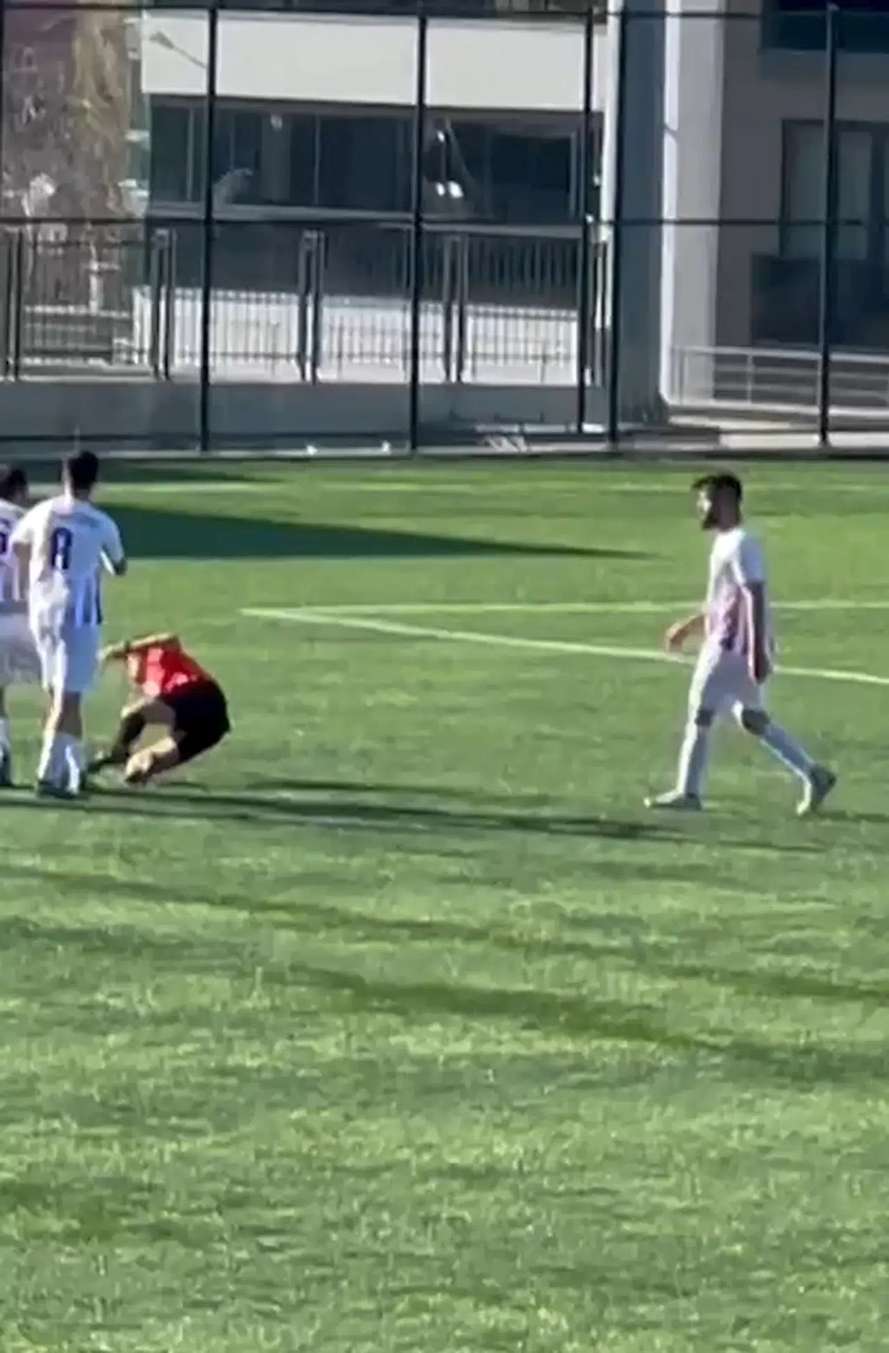 Bu arada, olay cep telefonuyla kayda alındı. Görüntüde, takım arkadaşlarının arkasında bulunan E.K.'nin zıplayıp, hakemin boyun bölgesine yumruk attığı anlar yer aldı.