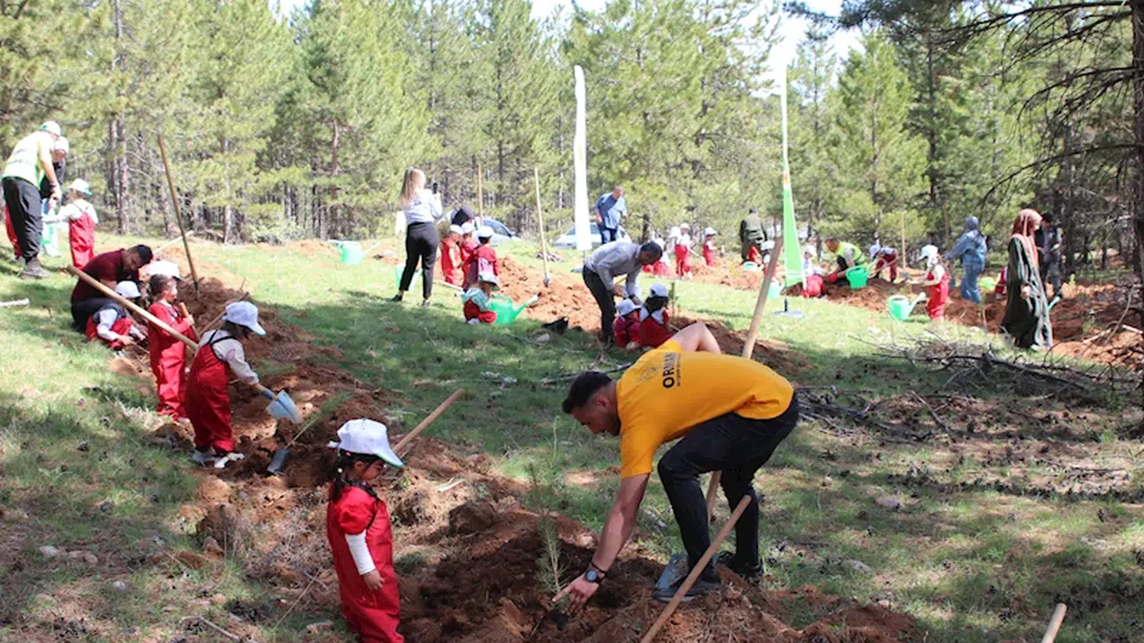Anaokulu öğrencileri, öğretmenlerinin ve Orman İşletme Müdürlüğüne bağlı çalışanların yardımıyla çam fidanlarını toprakla buluşturdu. Fidan dikiminin ardından çocuklar kendi elleriyle diktikleri fidanları suladı. (DHA)