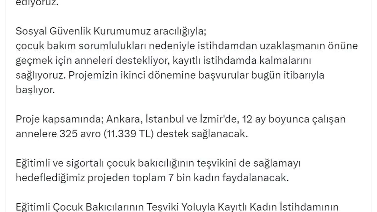 Gizem ÇORLU/ANKARA, (DHA)- ÇALIŞMA ve Sosyal Güvenlik Bakanı Vedat Işıkhan, Ankara, İstanbul ve İzmir'de, 12 ay boyunca çalışan annelere 325 avro (11 bin 339 TL) destek sağlanacağını açıkladı.