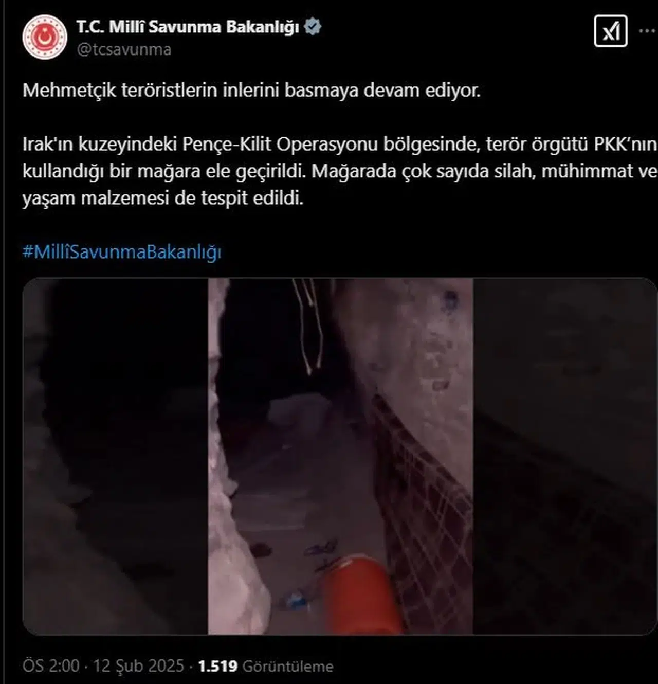 ANKARA, (DHA)- MİLLİ Savunma Bakanlığı (MSB), Irak'ın kuzeyinde Pençe-Kilit Operasyonu bölgesinde, terör örgütü PKK'nın kullandığı mağarada, çok sayıda silah, mühimmat ve yaşam malzemesi ele geçirildiğini açıkladı.