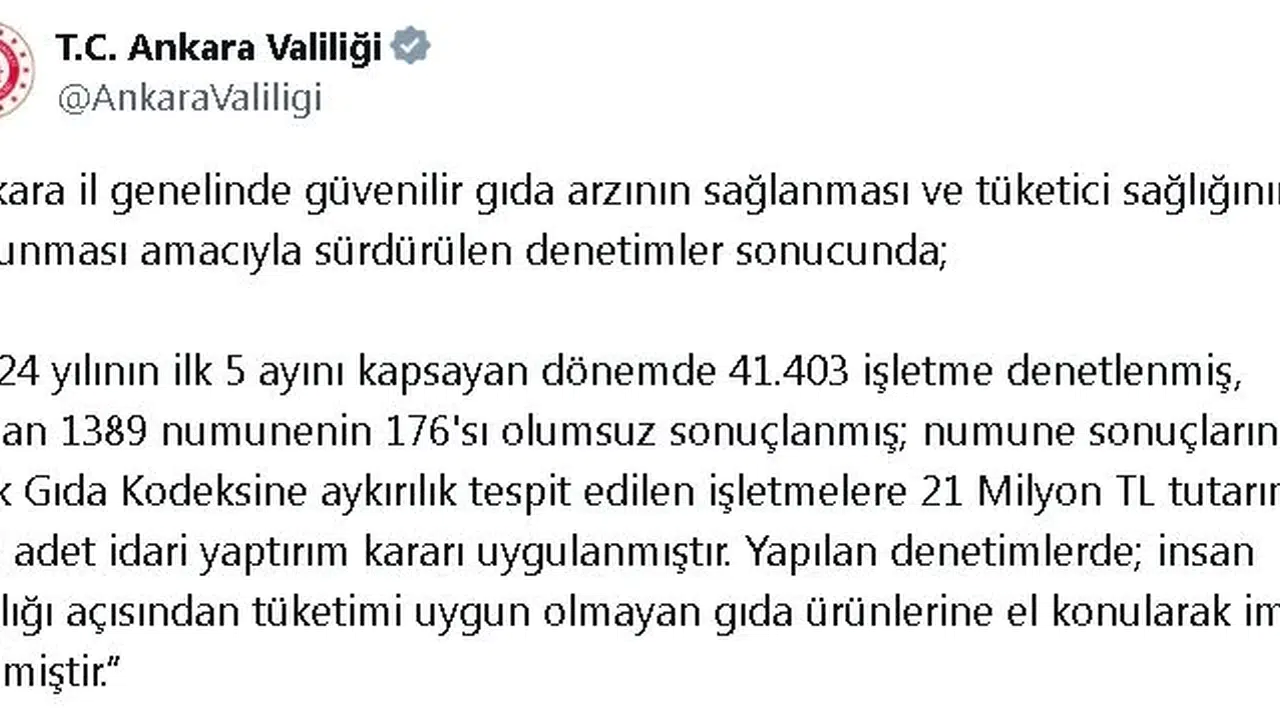 ANKARA, (DHA)- ANKARA Valiliği, il genelinde güvenilir gıda arzının sağlanması ve tüketici sağlığının korunması amacıyla sürdürülen denetimlerde, 2024 yılının ilk 5 ayında Türk Gıda Kodeksi'ne aykırılık tespit edilen işletmelere 21 milyon lira tutarında idari para cezası uygulandığını açıkladı.