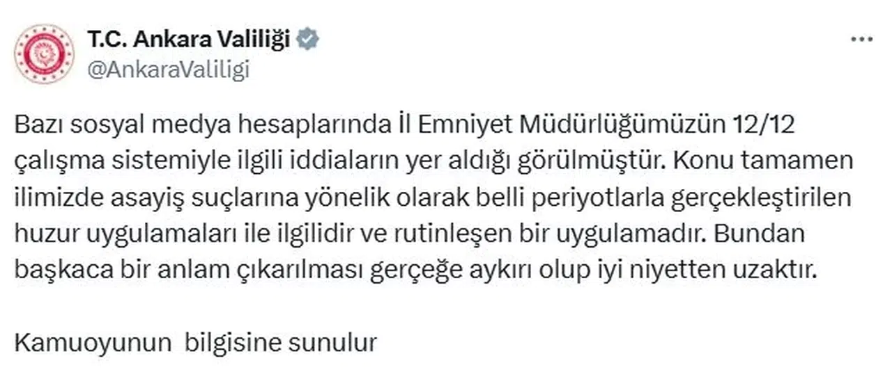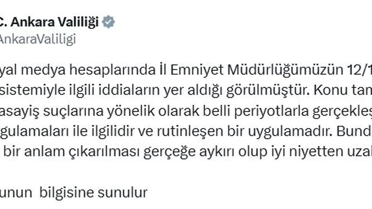 ANKARA, (DHA)- ANKARA Valiliği, sosyal medyada İl Emniyet Müdürlüğü’nün çalışma sistemiyle ilgili yer alan iddialara ilişkin açıklama yaptı.