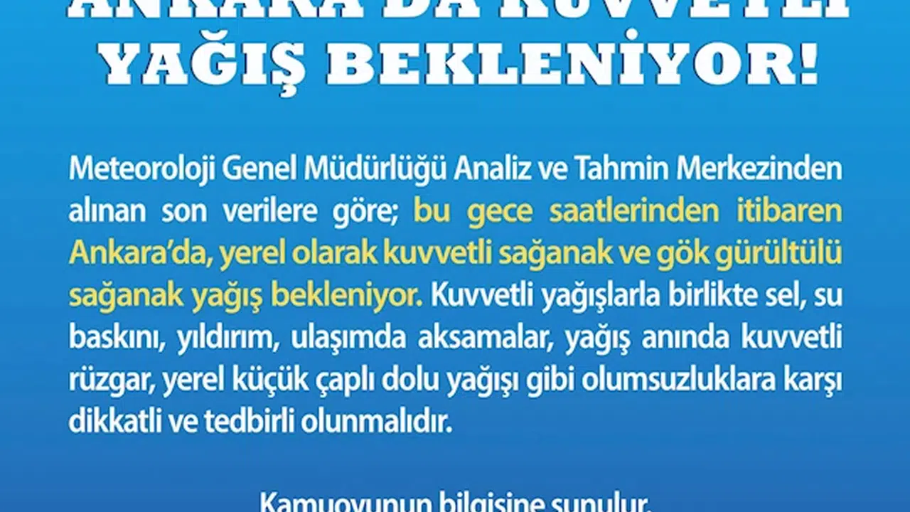 Valiliğin sosyal medya hesabından yapılan açıklamada, "Meteoroloji Genel Müdürlüğü Analiz ve Tahmin Merkezinden alınan son verilere göre; bu gece saatlerinden itibaren Ankara'da, yerel olarak kuvvetli sağanak ve gök gürültülü sağanak yağış bekleniyor. Kuvvetli yağışlarla birlikte sel, su baskını, yıldırım, ulaşımda aksamalar, yağış anında kuvvetli rüzgar, yerel küçük çaplı dolu yağışı gibi olumsuzluklara karşı dikkatli ve tedbirli olunmalıdır" denildi. (DHA)