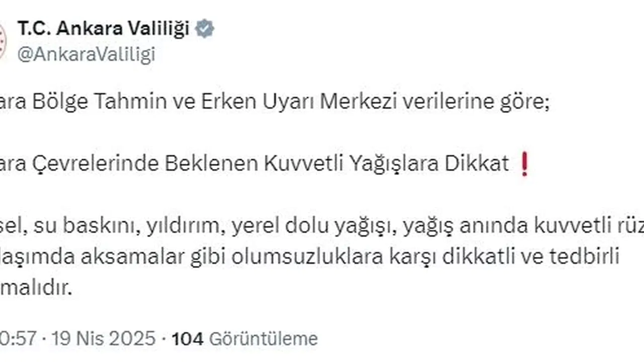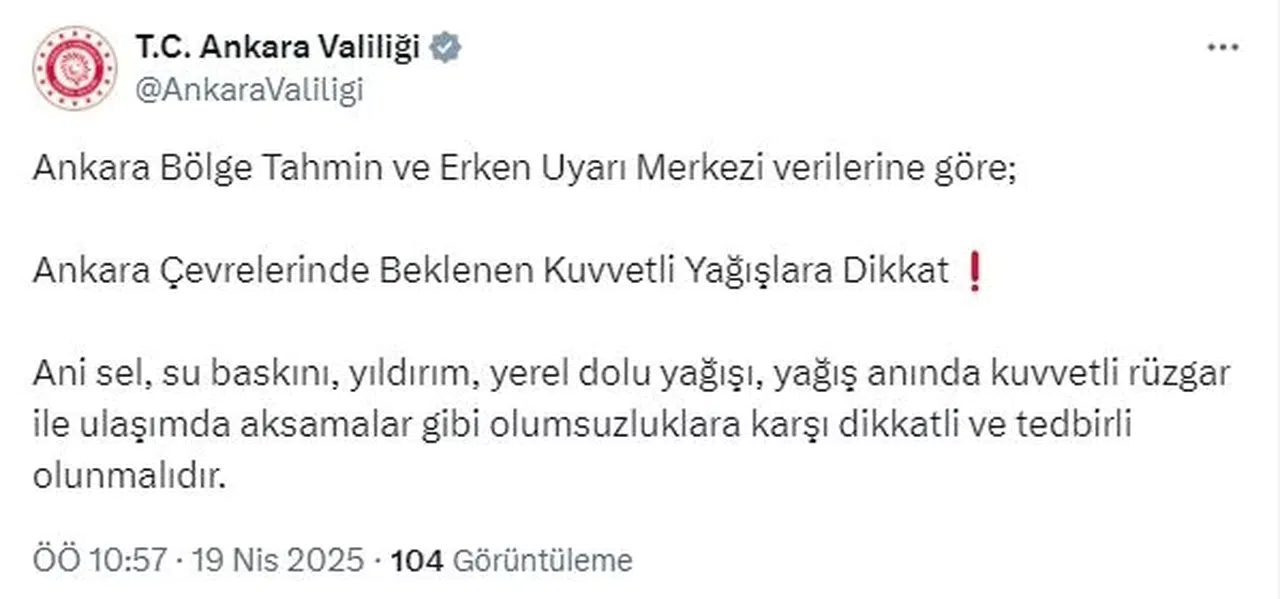 ANKARA, (DHA)- ANKARA Valiliği, kuvvetli rüzgar ve yağış uyarısında bulunarak vatandaşların tedbirli olmasını istedi.