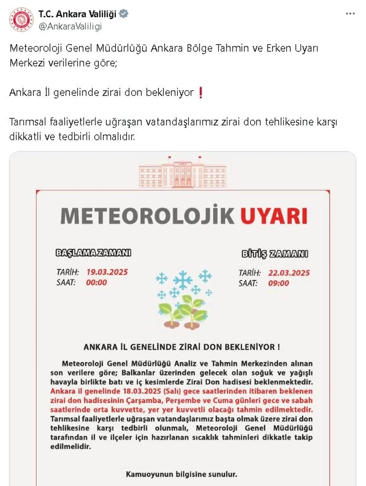 Ankara Valiliği'nden 'zirai don' uyarısı