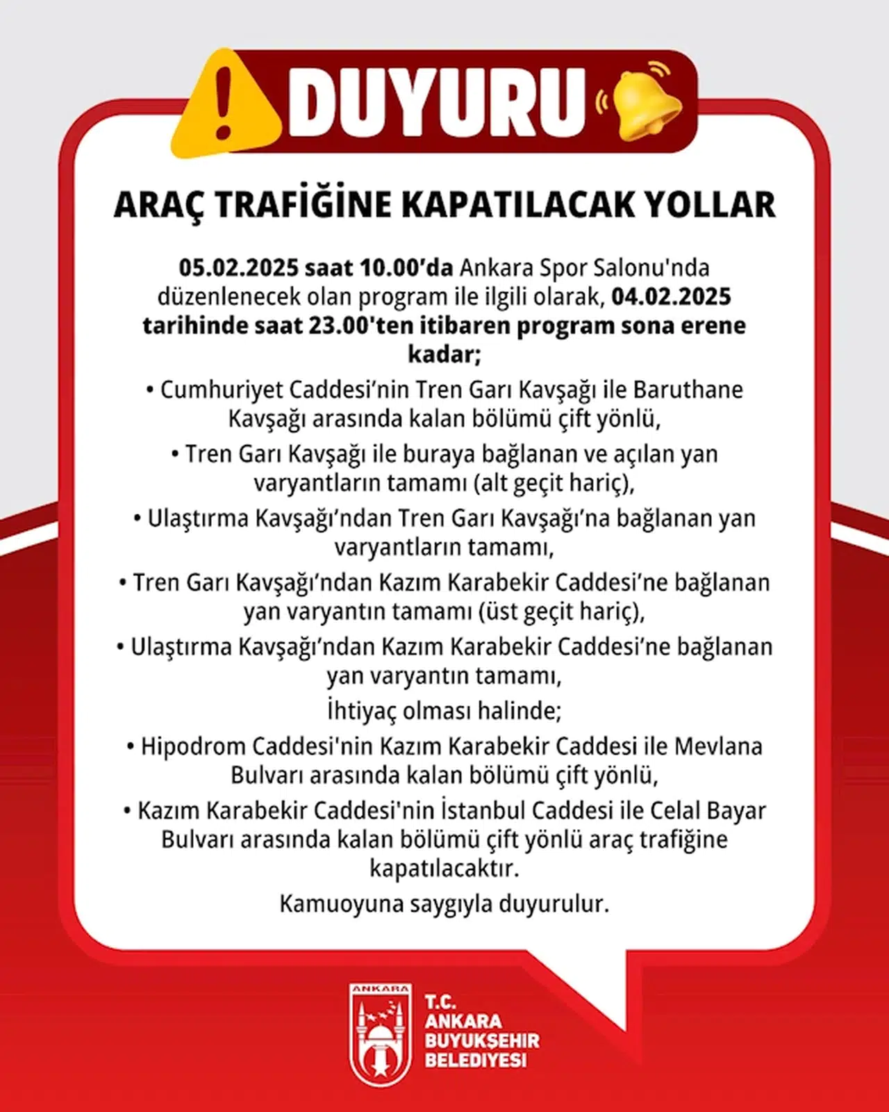 Ankara Büyükşehir Belediyesi'nden yapılan açıklamaya göre; yarın, Ankara Spor Salonu'nda düzenlenecek program nedeniyle, saat 23.00'ten itibaren Cumhuriyet Caddesi'nin Tren Garı Kavşağı ile Baruthane Kavşağı arasında kalan bölümü çift yönlü, Tren Garı Kavşağı ile buraya bağlanan ve açılan yan varyantların alt geçitler hariç tamamı, Ulaştırma Kavşağı'ndan Tren Garı Kavşağı'na bağlanan yan varyantın tamamı, Tren Garı Kavşağı'ndan Kazım Karabekir Caddesi'ne bağlanan yan varyantın üst geçitler hariç tamamı ve Ulaştırma Kavşağı'ndan Kazım Karabekir Caddesi'ne bağlanan yan varyantın tamamı, program sona erene kadar trafiğe kapalı olacak.