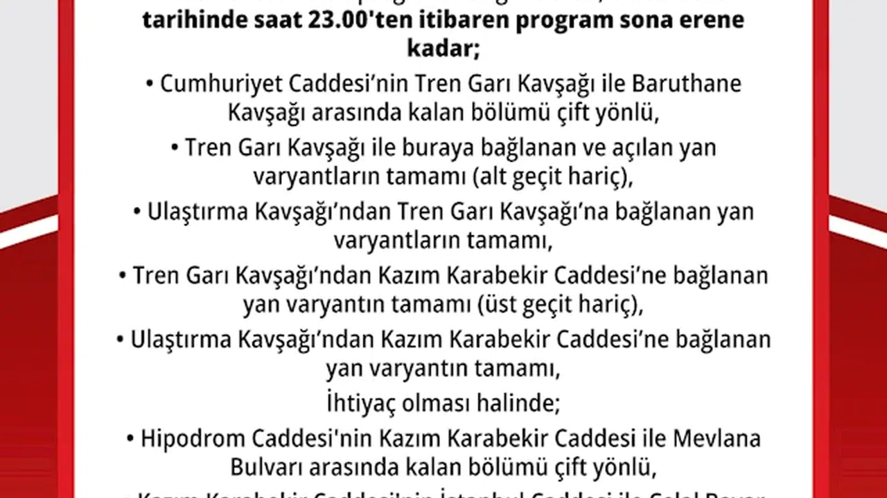 İhtiyaç duyulması halinde, Hipodrom Caddesi'nin Kazım Karabekir Caddesi ve Mevlana Bulvarı arasında kalan bölümü ile Kazım Karabekir Caddesi'nin İstanbul Caddesi ve Celal Bayar Bulvarı arasında kalan bölümü de çift yönlü araç trafiğine kapatılacak. (DHA)