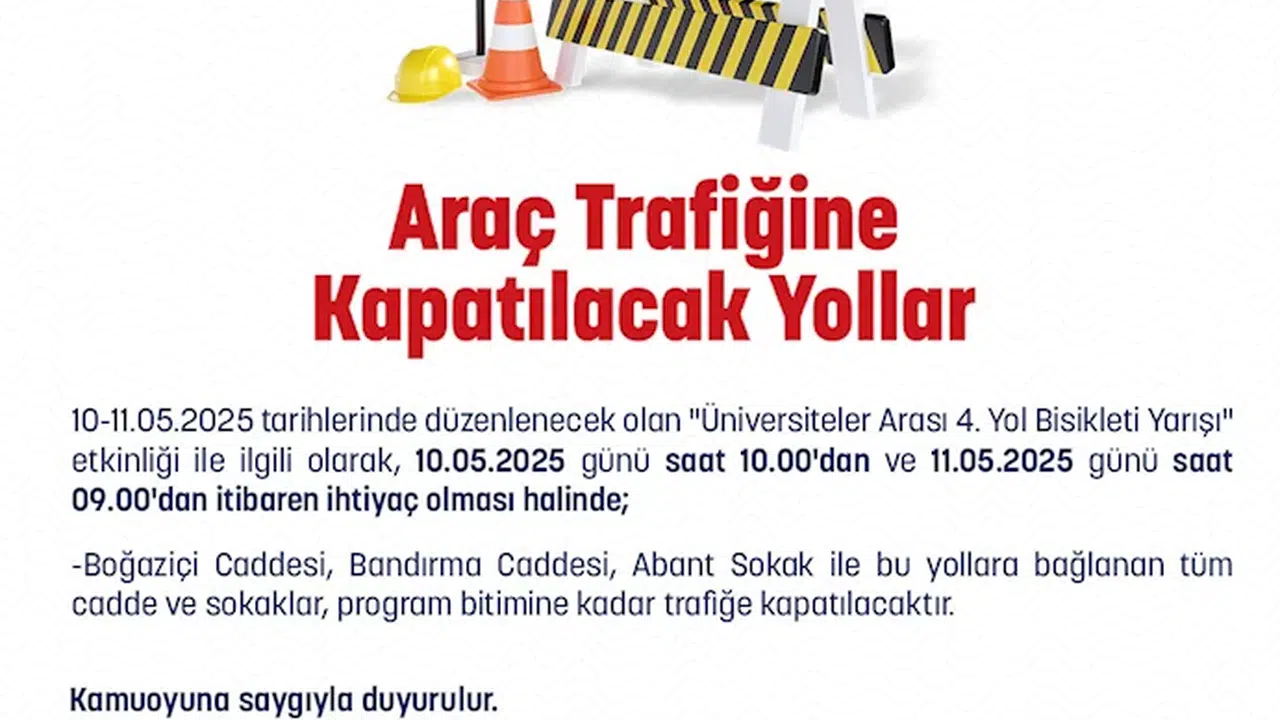Ankara Emniyet Müdürlüğü sosyal medya hesabından paylaşım yaparak, 10- 11 Mayıs tarihlerinde düzenlenecek olan ‘Üniversiteler Arası 4. Yol Bisikleti Yarışı’ etkinliği ile ilgili olarak, 10 Mayıs günü saat 10.00'dan ve 11 Mayıs günü saat 09.00'dan itibaren ihtiyaç olması halinde bazı yoların araç trafiğine kapatılabileceğini açıkladı. Yapılan açıklamada, ihtiyaç duyulması halinde, Boğaziçi Caddesi, Bandırma Caddesi, Abant Sokak ile bu yollara bağlanan tüm cadde ve sokakların, program bitimine kadar trafiğe kapatılacağı belirtildi. (DHA)