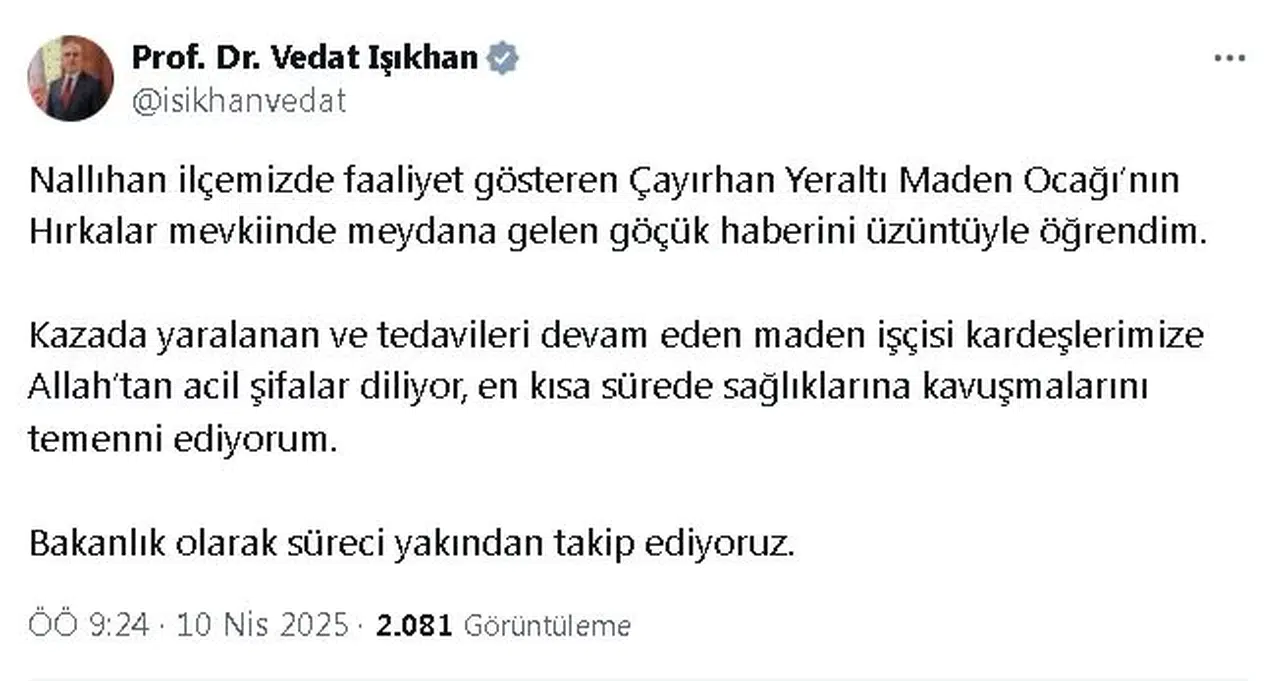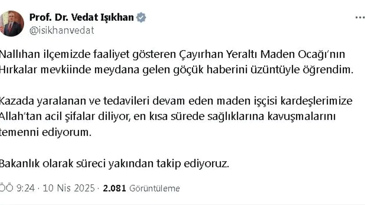 Çalışma ve Sosyal Güvenlik Bakanı Vedat Işıkhan, sosyal medya hesabından yaptığı açıklamada, "Nallıhan ilçemizde faaliyet gösteren Çayırhan Yeraltı Maden Ocağı'nın Hırkalar mevkisinde meydana gelen göçük haberini üzüntüyle öğrendim. Kazada yaralanan ve tedavileri devam eden maden işçisi kardeşlerimize Allah'tan acil şifalar diliyor, en kısa sürede sağlıklarına kavuşmalarını temenni ediyorum. Bakanlık olarak süreci yakından takip ediyoruz" ifadelerini kullandı. (DHA)