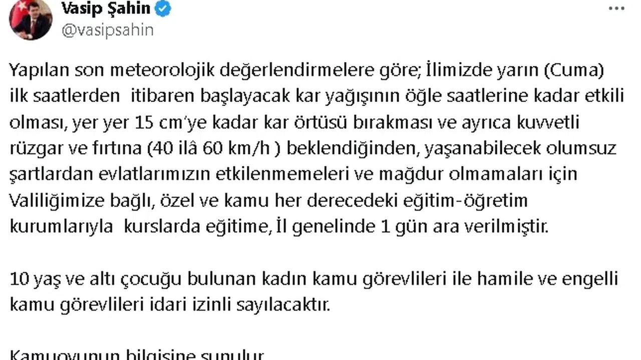 Vali Şahin, sosyal medya hesabından yaptığı paylaşımda, "Yapılan son meteorolojik değerlendirmelere göre; İlimizde yarın (Cuma) ilk saatlerden itibaren başlayacak kar yağışının öğle saatlerine kadar etkili olması, yer yer 15 cm’ye kadar kar örtüsü bırakması ve ayrıca kuvvetli rüzgar ve fırtına (40 ila 60 km/h ) beklendiğinden, yaşanabilecek olumsuz şartlardan evlatlarımızın etkilenmemeleri ve mağdur olmamaları için Valiliğimize bağlı, özel ve kamu her derecedeki eğitim-öğretim kurumlarıyla kurslarda eğitime, il genelinde 1 gün ara verilmiştir. 10 yaş ve altı çocuğu bulunan kadın kamu görevlileri ile hamile ve engelli kamu görevlileri idari izinli sayılacaktır. Kamuoyunun bilgisine sunulur" ifadelerini kullandı. (DHA)