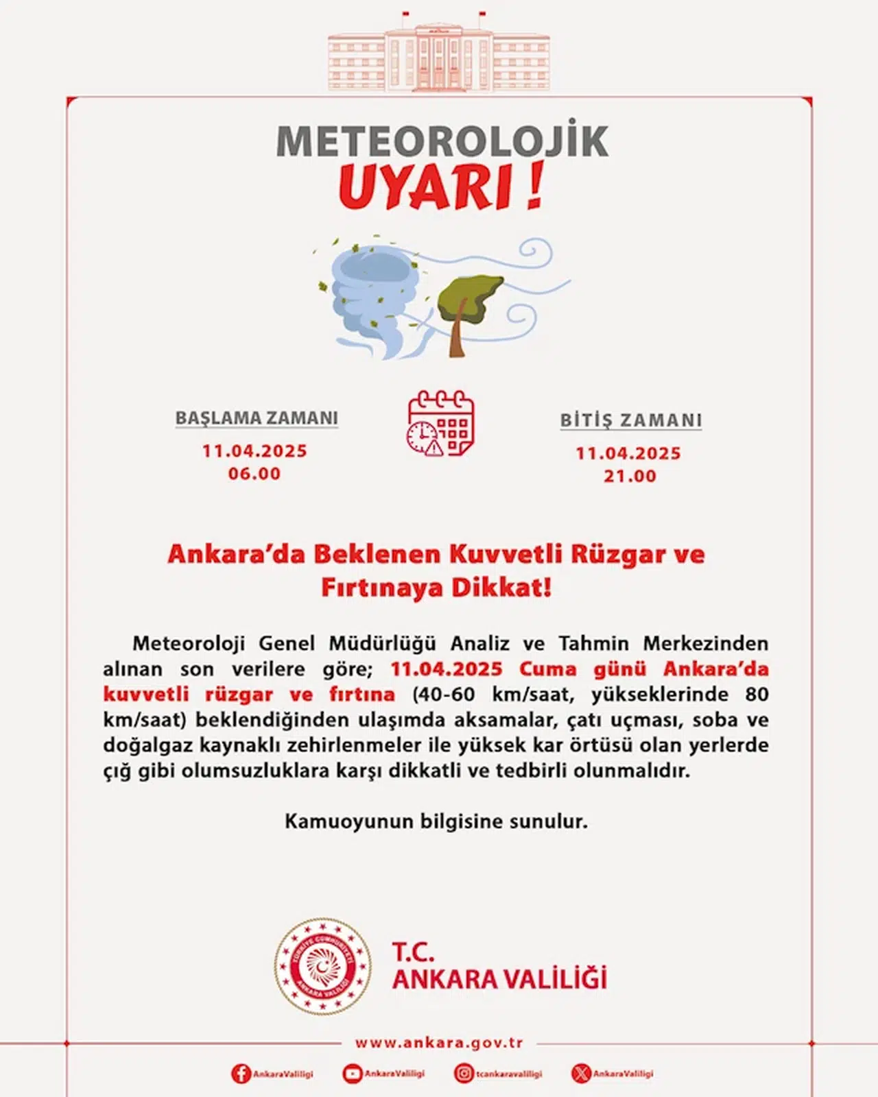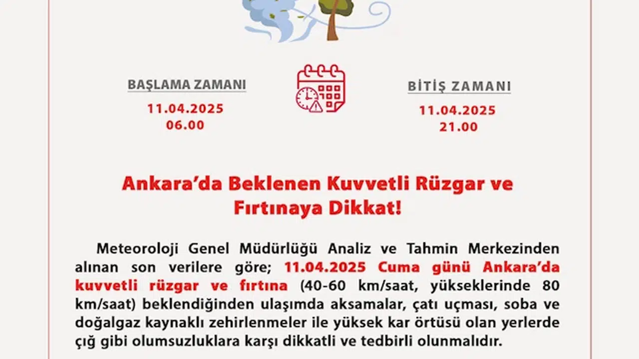 Valilik, aynı gün rüzgar ve fırtına nedeniyle yaşanabilecek olumsuzluklara karşı da uyarıda bulundu. Açıklamada, 11 Nisan Cuma günü Ankara'da kuvvetli rüzgar ve fırtına (40-60 km/saat, yükseklerinde 80 km/saat) beklendiği de belirtilerek, "Çatı uçması, soba ve doğal gaz kaynaklı zehirlenmelerle yüksek kar örtüsü olan yerlerde çığ gibi olumsuzluklara karşı dikkatli ve tedbirli olunmalıdır" denildi. Kuvvetli rüzgar ve fırtınanın saat 06.00 ile 21.00 arasında etkili olmasının beklendiği belirtildi. (DHA)