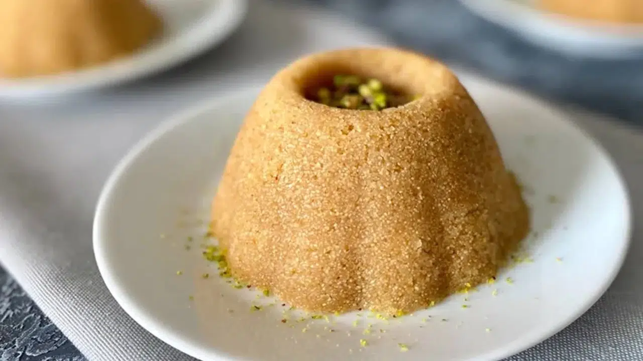 Servis sırasında bir kâseye irmik helvasını koyup ters çevirerek sunum yapabilirsiniz.