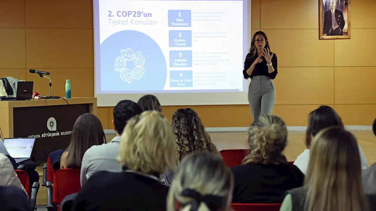 Bakü’deki COP29’dan dönen belediye temsilcileri, Antalya Büyükşehir Belediyesi bünyesindeki ilgili birimlere yönelik bir bilgilendirme toplantısı gerçekleştirdi. Toplantıda, COP29 deneyimleri, elde edilen kazanımlar, uluslararası gözlemler ve iklim değişikliğiyle mücadelede atılacak adımlar değerlendirildi. Başkan Danışmanı Atasoy, 29'uncu Taraflar Konferansı’nda Antalya Büyükşehir Belediyesi’nin iklim değişikliğine karşı yürüttüğü çalışmalar ve yerel yönetimlerin bu süreçteki rolü üzerine bir sunum gerçekleştirildiğini belirtti.