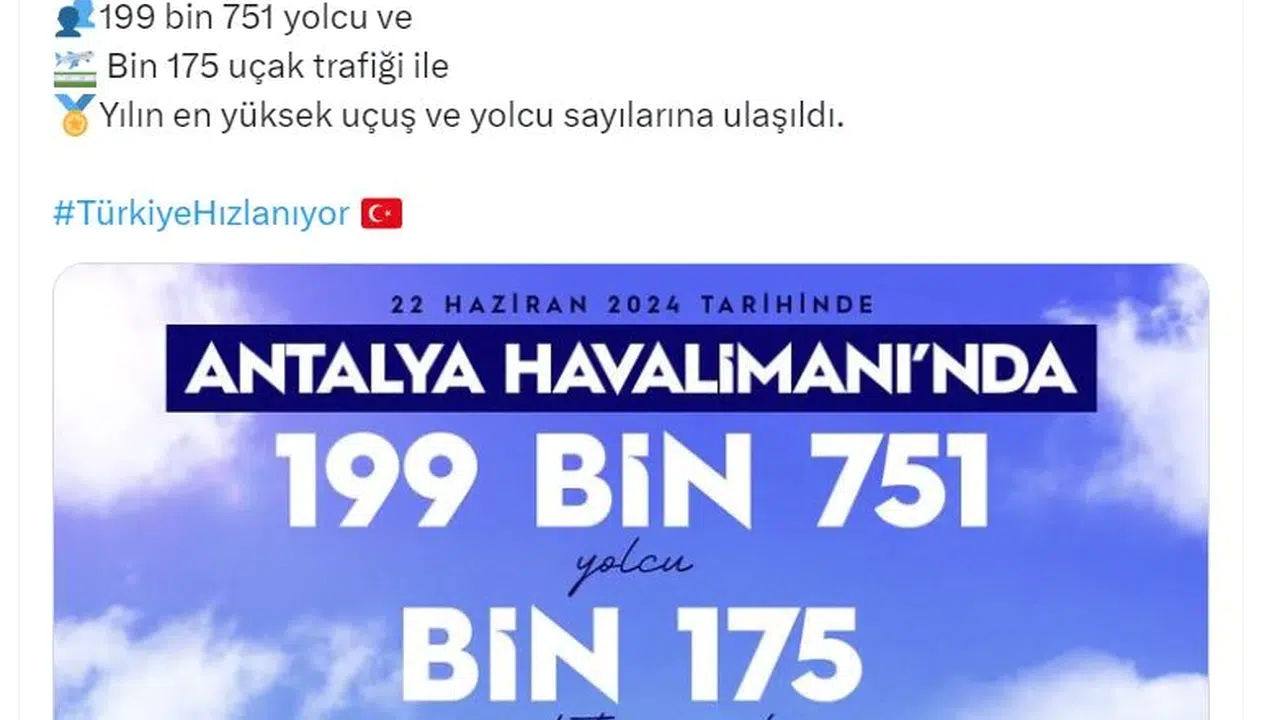 ANKARA, (DHA)- ULAŞTIRMA ve Altyapı Bakanı Abdulkadir Uraloğlu, dün Antalya Havalimanı'nda 199 bin 751 yolcu ve 1175 uçak trafiği ile yılın en yüksek uçuş ve yolcu sayılarına ulaşıldığını duyurdu.