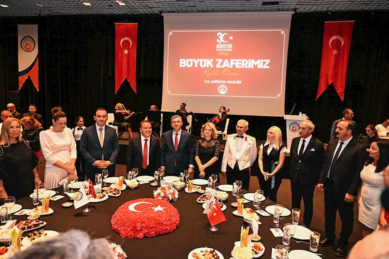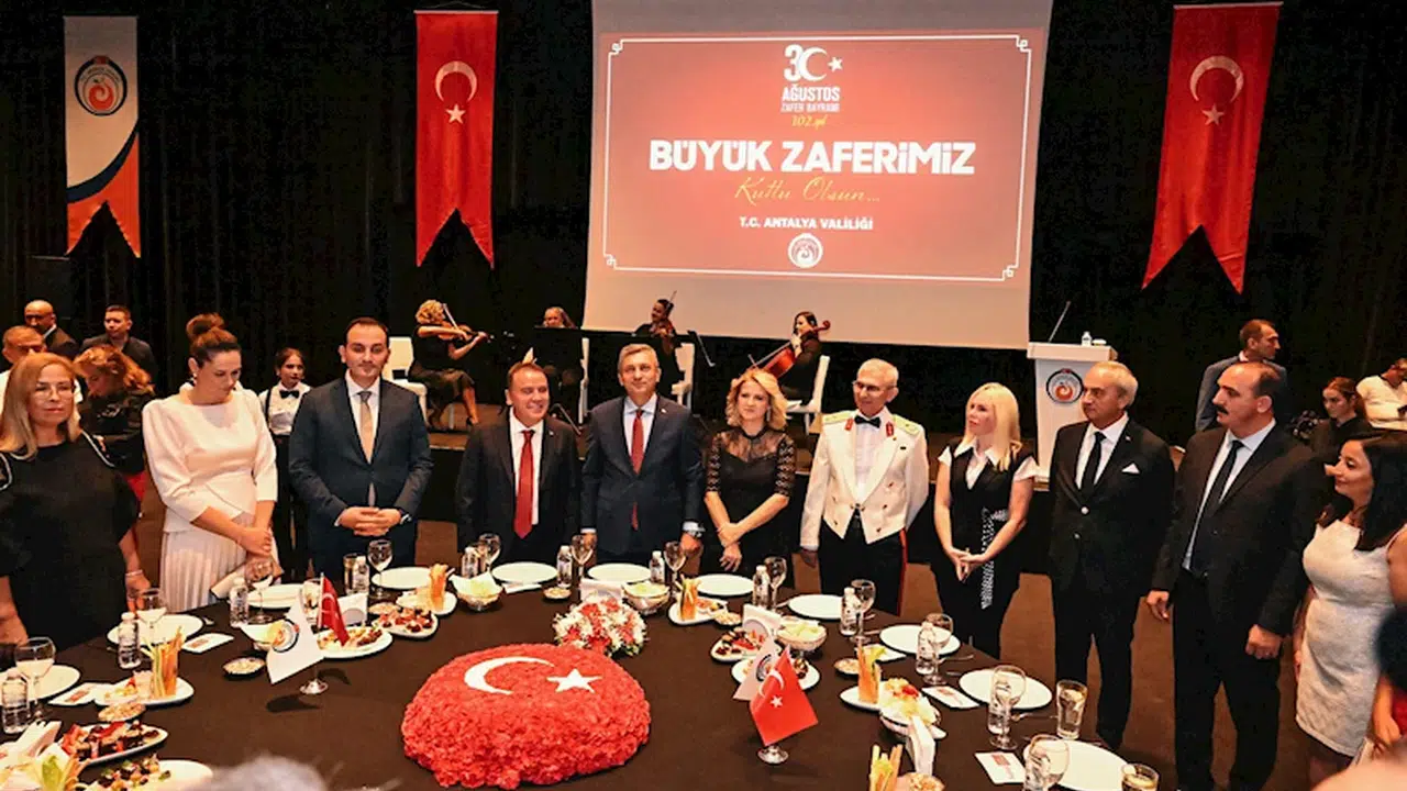 Antalya il protokolü, kamu kurum müdürleri, sivil toplum kuruluşu temsilcileri, şehit aileleri, gaziler ve milli sporcular katıldığı resepsiyonda Vali Hulusi Şahin ve eşi Ebru Şahin tüm konukları karşılayarak Zafer Bayramlarını tebrik etti. Antalya Devlet Senfoni Orkestrası sanatçılarının müzik dinletisi eşliğinde geçen resepsiyonda 30 Ağustos kısa filmi beğeniyle izlendi.