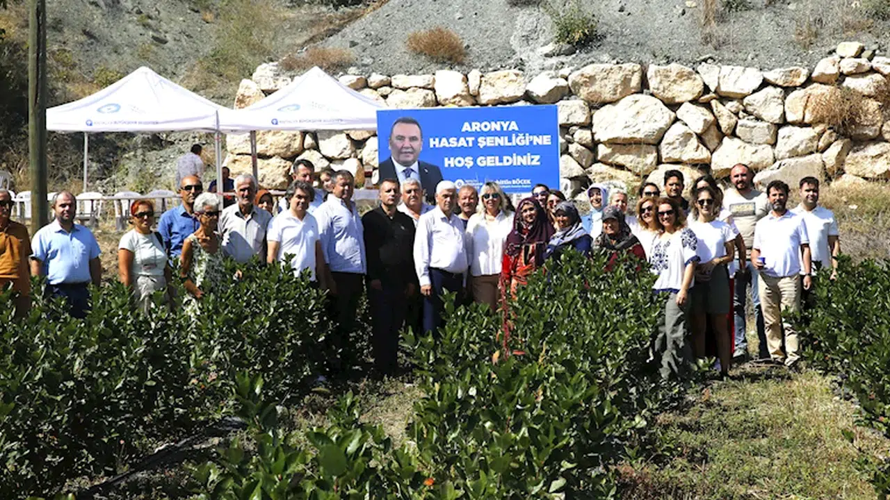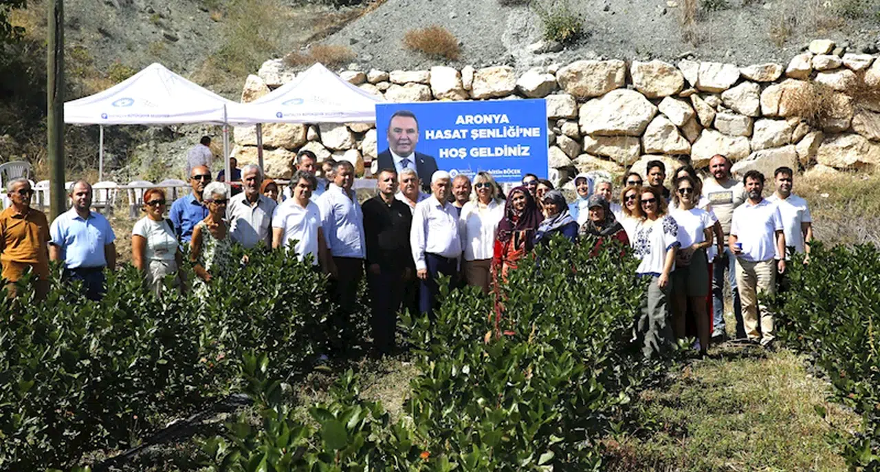 Antalya Büyükşehir Belediye Başkanı Muhittin Böcek'in yerelden kalkınma hamlesiyle başlattığı tarımsal destek projeleri üreticilerin yüzünü güldürüyor. Ekonomik değeri yüksek tıbbi ve aromatik bitki üretimine teşvik etmek amacıyla üreticilerle buluşturulan aronyanın bu yılki ilk hasadı Konyaaltı Doyran Mahallesi'nde düzenlenen hasat şenliği ile yapıldı. Doyran'da iki yıl önce fidan desteği yapılan çiftçilerin aronya bahçelerinde gerçekleşen hasat şenliğine Tarımsal Hizmetler Dairesi Başkanı Seda Özel, Antalya Ziraat Odası Başkanı Nazif Alp, muhtarlar ve üreticiler katıldı.