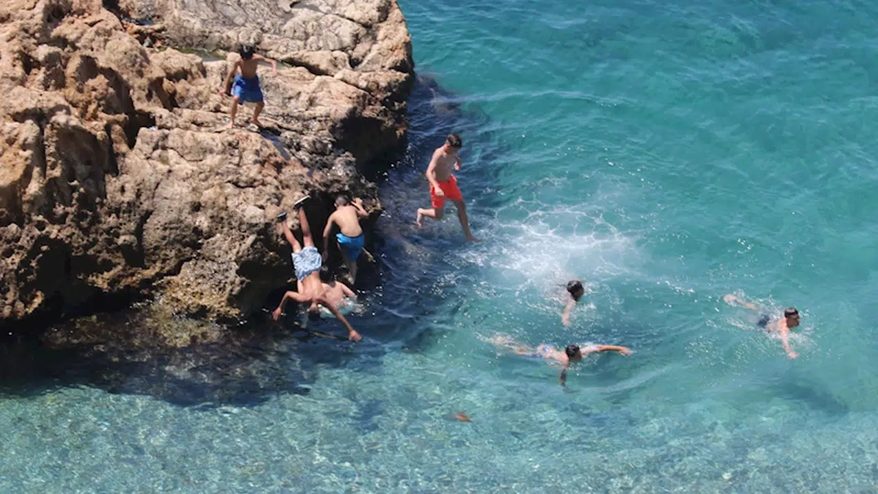 Hemen hemen her sene rastlanan kayalık üzerinden denize atlayışlar, bu yıl da değişmedi. Konyaaltı Sahili'ne varyant tarafından giriş yapıldığında hemen falezlerin altında bulunan 6 metrelik kayaya çıkanlar, tehlikeye aldırış etmeden kendilerini suya bıraktı.