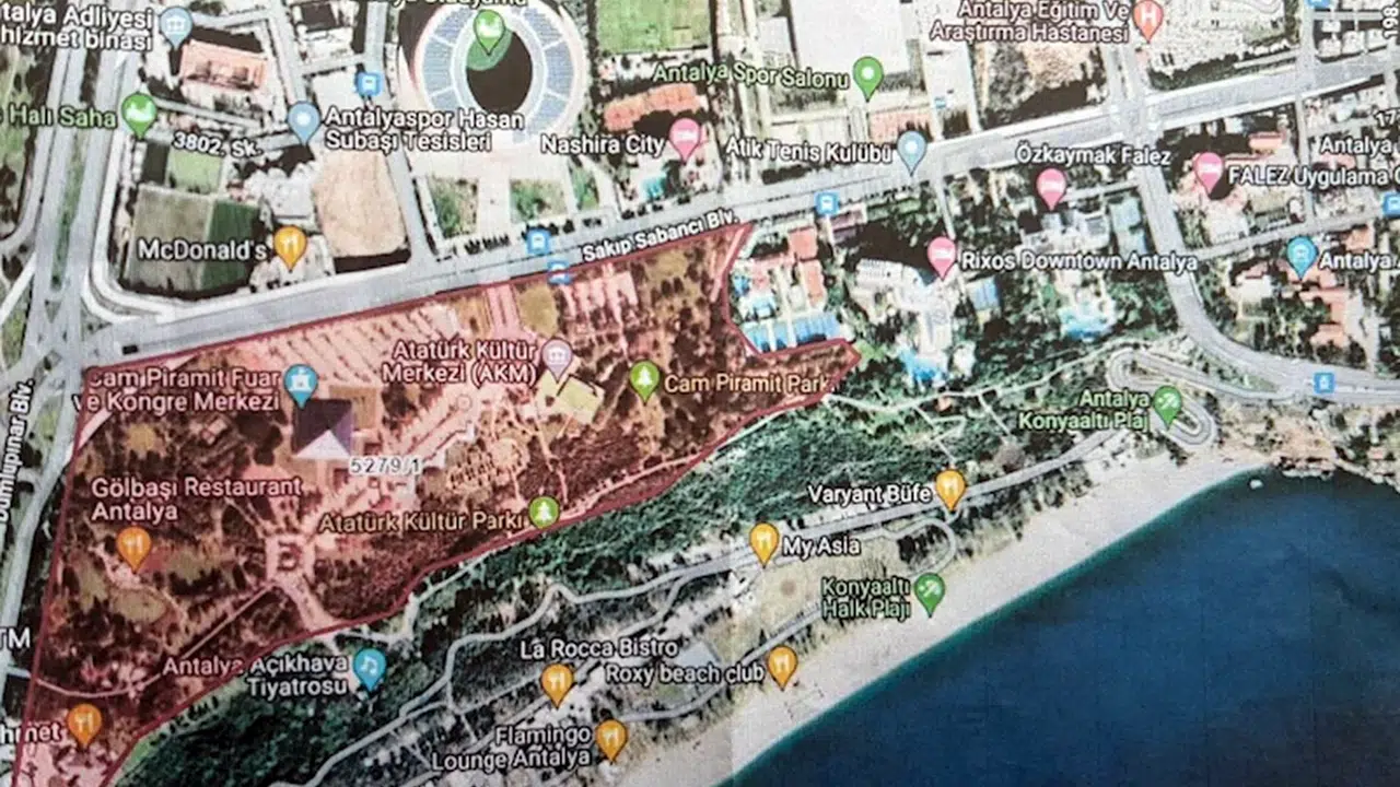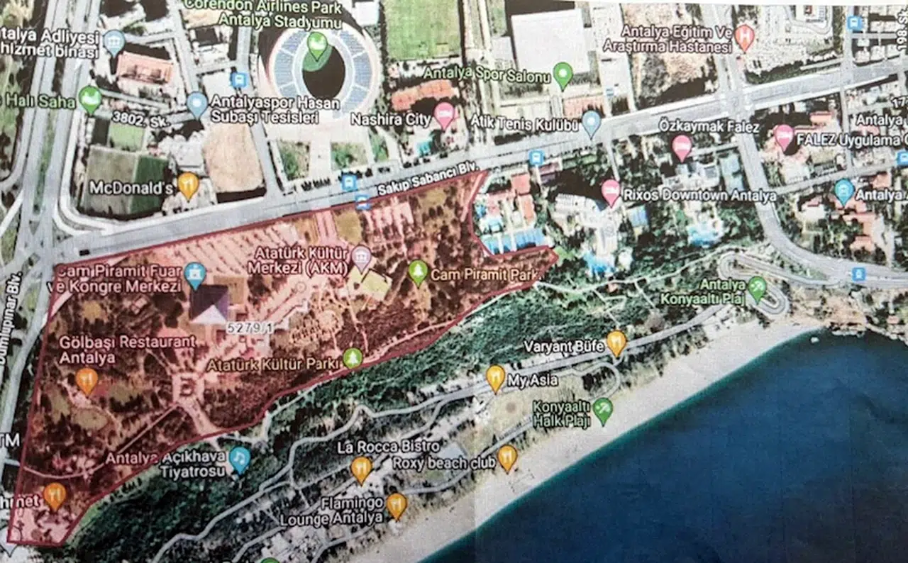 “Konuyu bir haritayla anlatmak istiyorum. Hepimizin bildiği Turizm Uygulama Oteli, Eğitim Araştırma Hastanesi, Falez ve Rixos otelleri, Cam Piramit Parkı, AKM, Atatürk Kültür Parkı, Cam Piramit Fuar ve Kongre Merkezi, Atik Tenis İhtisas Kulubü, akaryakıt istasyonu, Antalyaspor Tesisleri, Corendon Stadyumu, Antalya Adliyesi, Antalya Spor Salonu.. Daha gerilere gidelim; ANTKOOP ve sayısız sitelerdeki 10 bin civarında konut, Meltem Pazar Yeri, tesisler, okullar, parklar, Tapu Bölge Müdürlüğü, camiler, yeni adliyeye kadar otoparklar, kooperatifler ve daha birçok yapının malikleri var. Ama bunların taşınmazları üzerinde dava süresinde yasal kamulaştırmalar veya yasaya uygun olmayan biçimde kamulaştırma yapmadan resmi makamlarca tesisler kurulmuş. Yani, tapu malikleri bu haklarını kullanma olanağından mahrum durumdalar."
