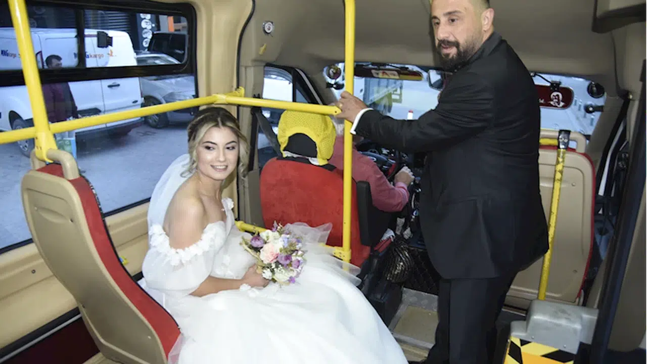 Artvinli Tolgahan Aydemir ile Adanalı Şifa Kabayel, düğünleri için gelin arabası hazırlamak yerine toplu taşımadan yararlanmaya karar verdi.