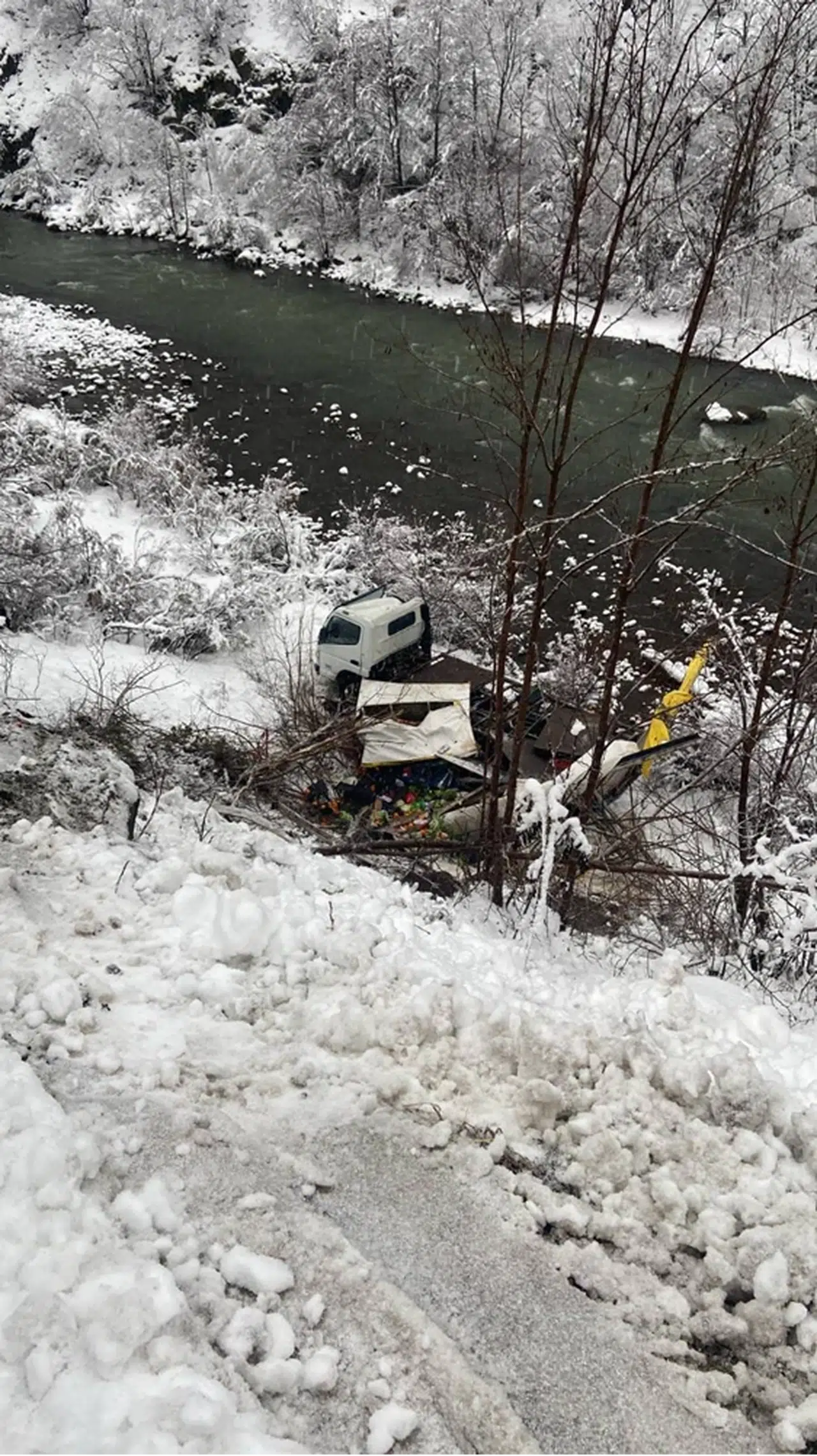 Artvin - Şavşat karayolu Eskikale yol ayrımı mevkiinde Erkan İpekoğlu'nun (34) kullandığı 08 ABJ 497 plakalı meyve sebze yüklü kamyon, yolun karlı olması nedeniyle kontrolden çıkarak dere kenarına devrildi.