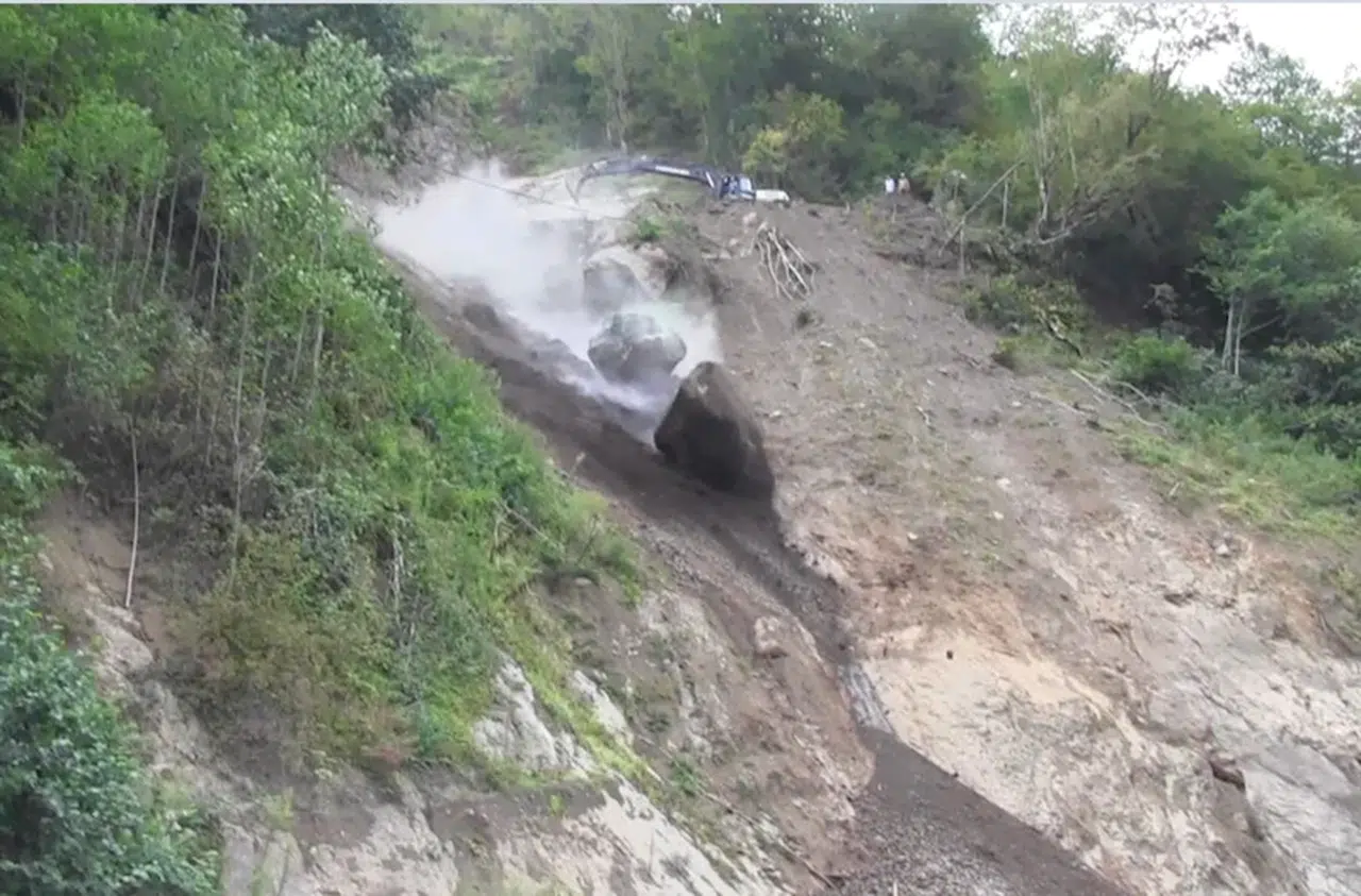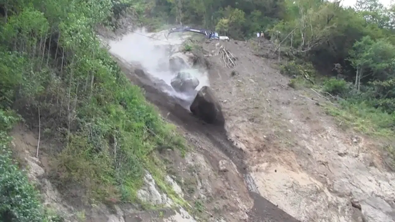Nurbay USTA/BORÇKA (Artvin), (DHA)- ARTVİN'in Borçka ilçesine 8 köye ulaşım sağlanan yol güzergahında yamaçta tehlike oluşturan kayalar, iş makineleriyle temizlendi. Risk taşıyan dev kayaların düşürülme anları kameraya yansıdı.