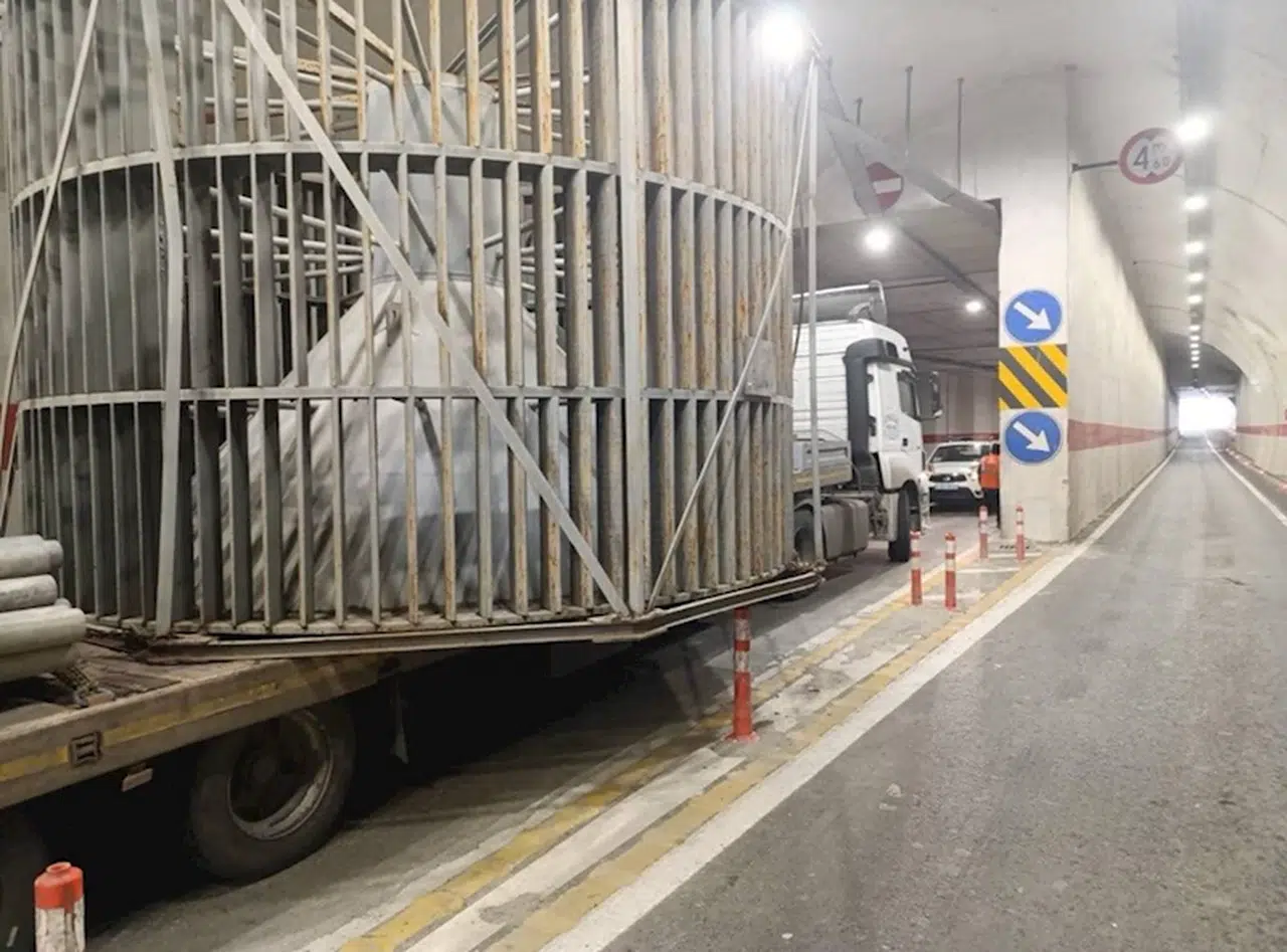 Maden öğütme eleği taşıyan 54 B 6743 plakalı tır, Artvin-Erzurum kara yolunun Sebzeciler köyü mevkisindeki T21 tüneli içinde sıkıştı.