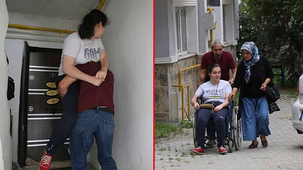 Artvin'de yaşayan bedensel engelli 11. sınıf öğrencisi Elif Sude Dursun, ailesinin oturduğu apartmanda asansör bulunmaması nedeniyle babasının yardımıyla her gün okula gitmek için merdivenleri kucağında inip çıkıyor. Elif Sude, genellikle evden dışarı çıkamadığı için karnesini her yıl annesi alıyor.