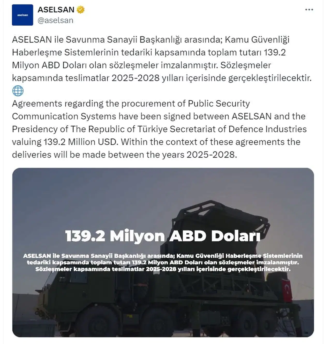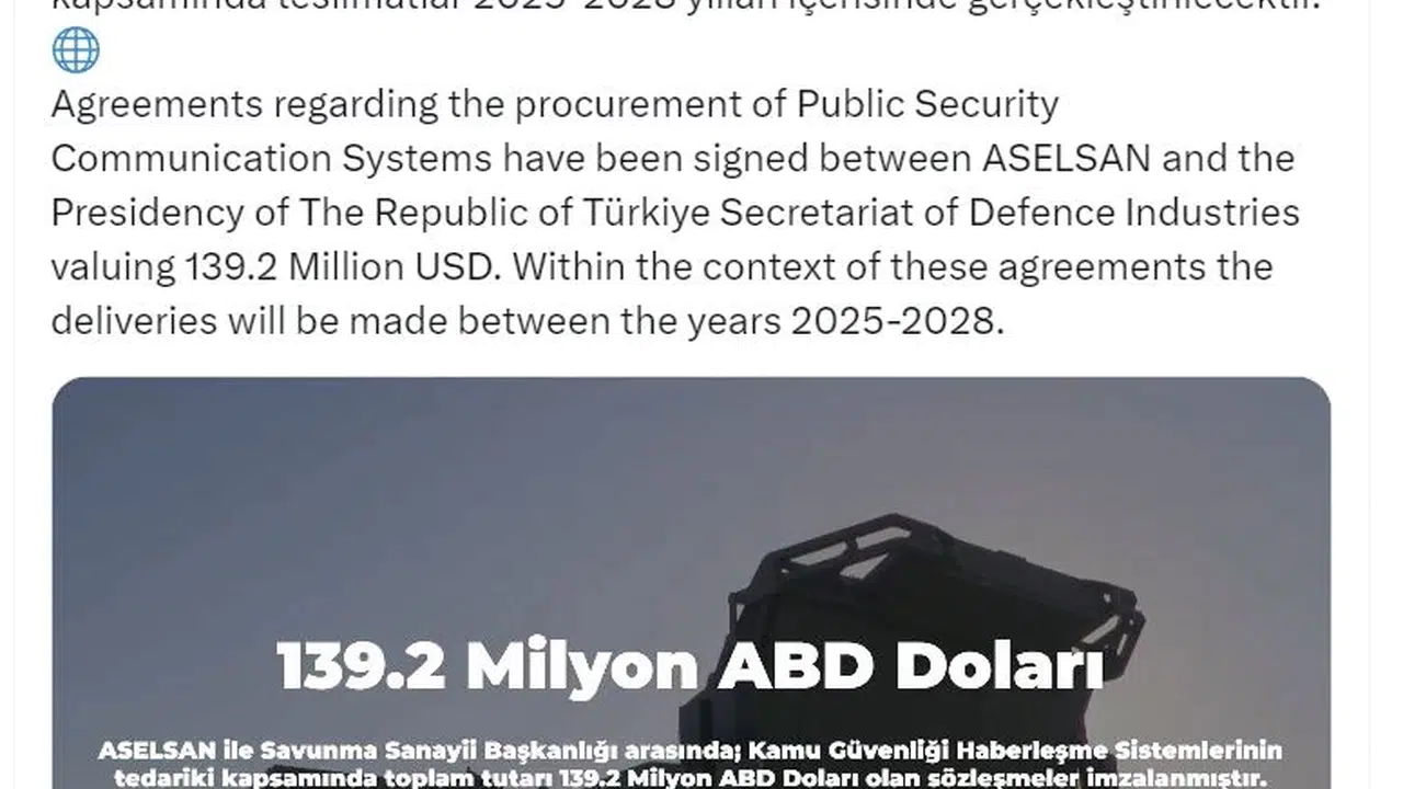 ASELSAN'ın sosyal medya hesabından yapılan açıklamada, "ASELSAN ile Savunma Sanayii Başkanlığı arasında; kamu güvenliği haberleşme sistemlerinin tedariki kapsamında toplam tutarı 139,2 milyon ABD doları olan sözleşmeler imzalanmıştır. Sözleşmeler kapsamında teslimatlar 2025-2028 yılları içerisinde gerçekleştirilecektir" denildi. (DHA)