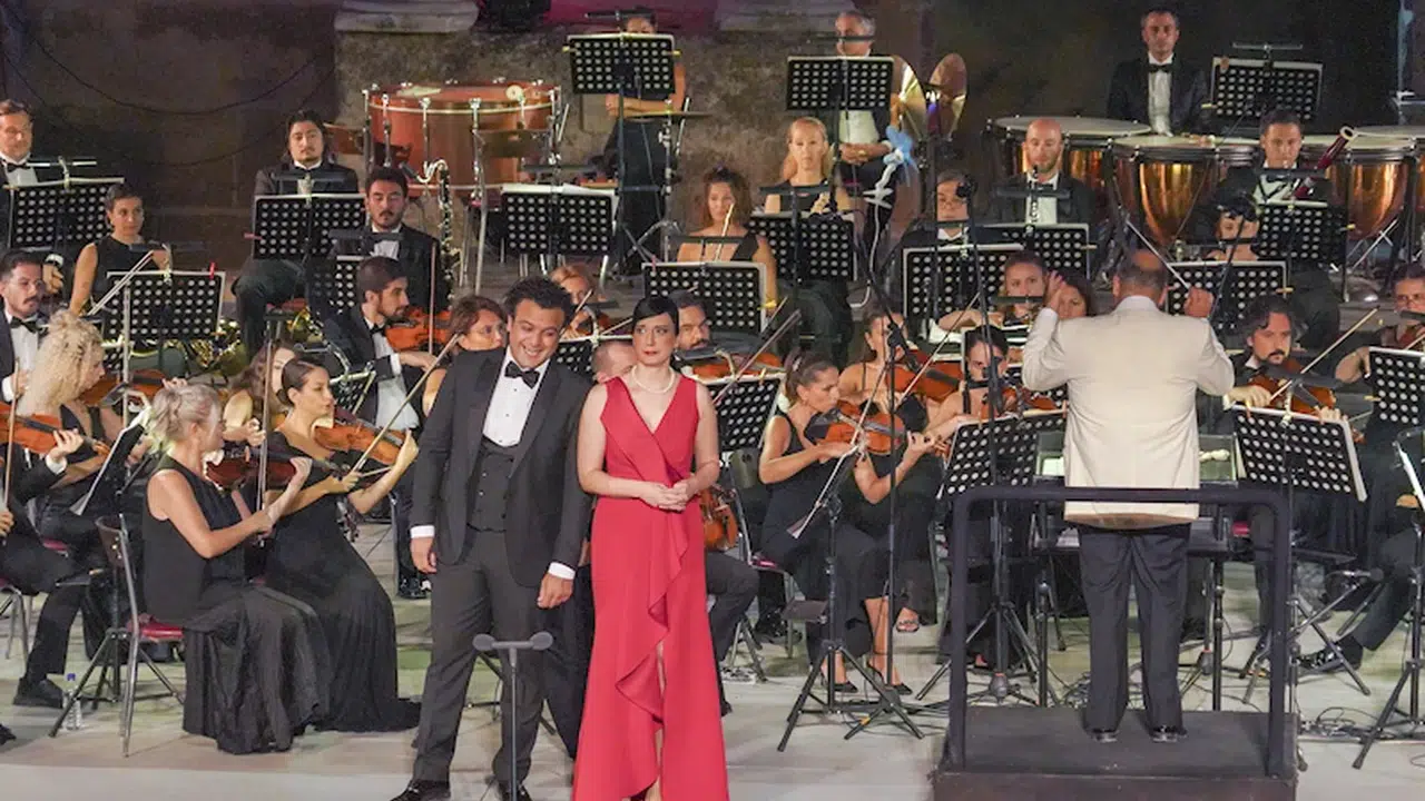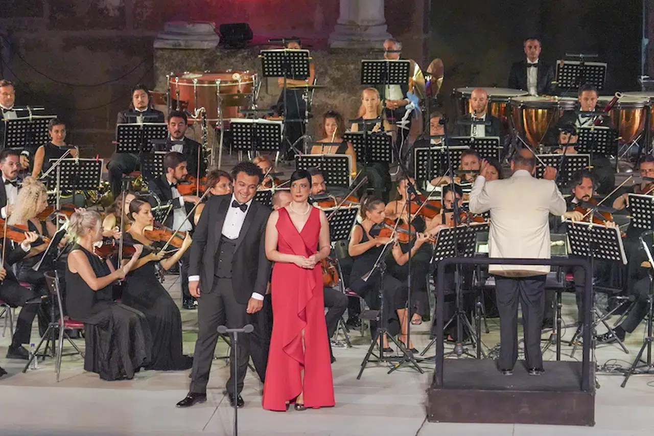 Solist opera sanatçıları ile orkestra, tarihi tiyatroyu dolduran yerli ve yabancı izleyicilere müzik dolu bir gece yaşattı.