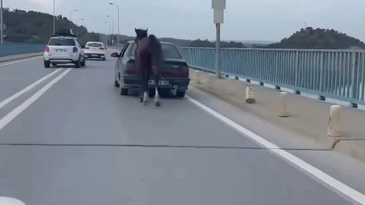 ADANA. (DHA)-ADANA'da bir atı otomobile bağlayarak trafikte ilerleyen sürücü S.T. ile yanındaki A.Ç., hayvana eziyet suçlamasıyla tutuklandı.