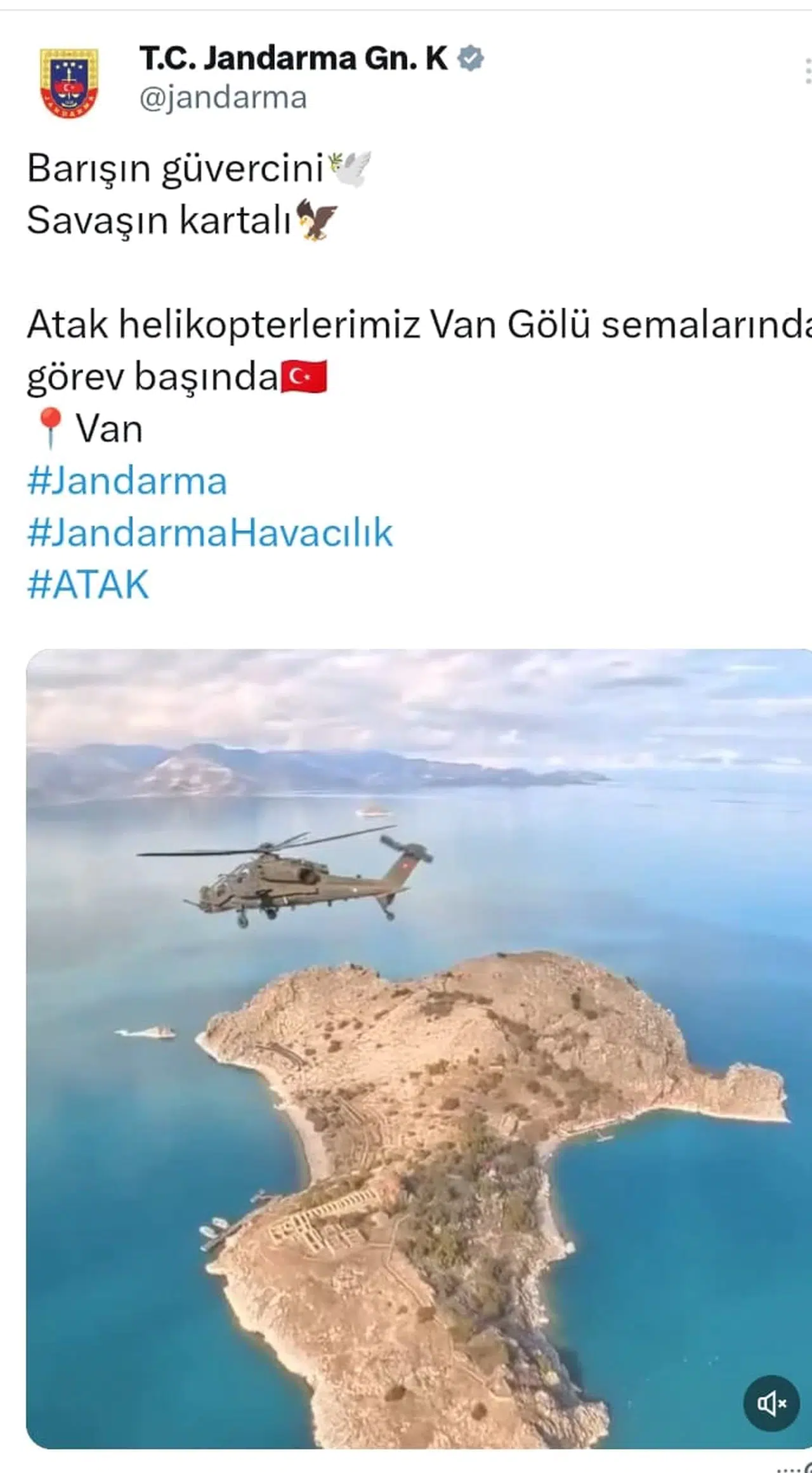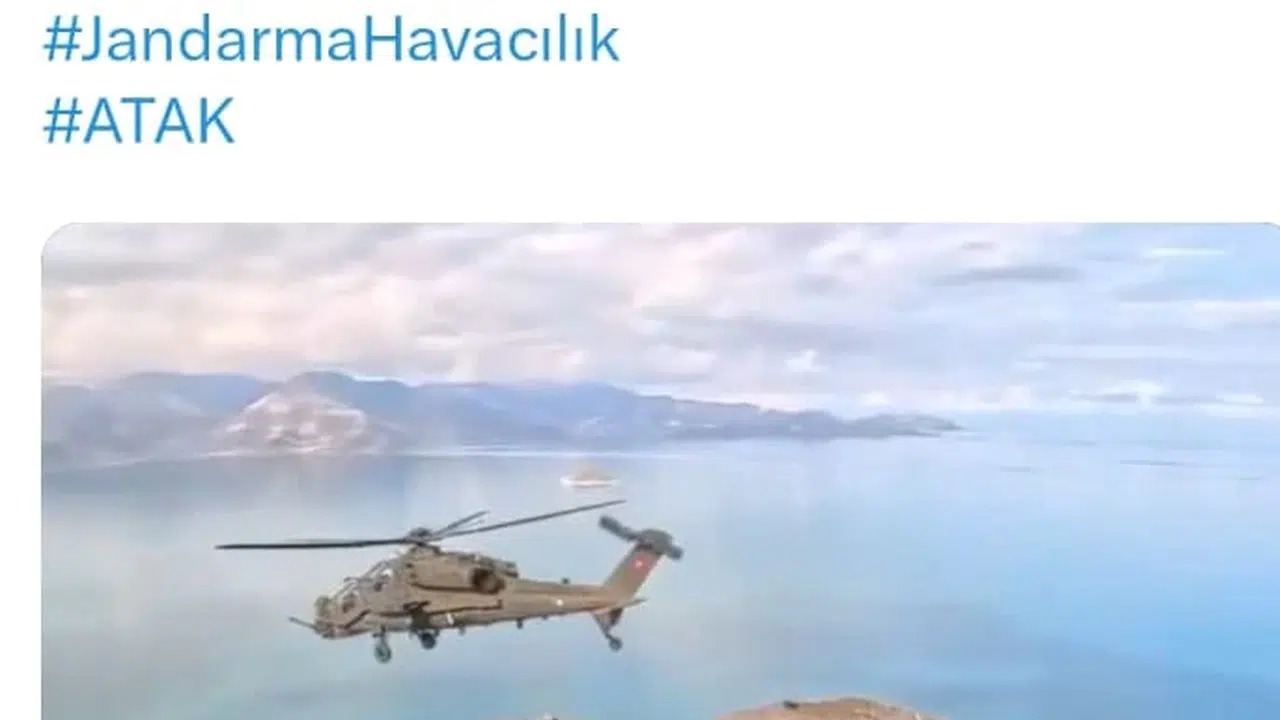 Jandarma Atak helikopterlerinin görev sırasında Van Gölü üzerinde kaydedilen görüntü ve fotoğraflar, Jandarma Genel Komutanlığı'na ait sosyal medya hesabında paylaşıldı. Van Gölü ve göl içerisindeki Akdamar Adası'nın yer aldığı görsellerin üzerine 'Barışın güvercini, savaşın kartalı Atak helikopterlerimiz Van Gölü semalarında görev başında' ifadelerine yer verildi. Paylaşılan video, sosyal medya kullanıcıları tarafından binlerce kez izlendi. 2 Atak helikopteri Van Gölü üzerindeyken, diğer helikopterin kamerasına yansıyan Van Gölü'nün masmavi suları içerisindeki Akdamar Adası ile Edremit ilçesinin güzel görüntüleri, kullanıcıların beğenisini topladı. (DHA)